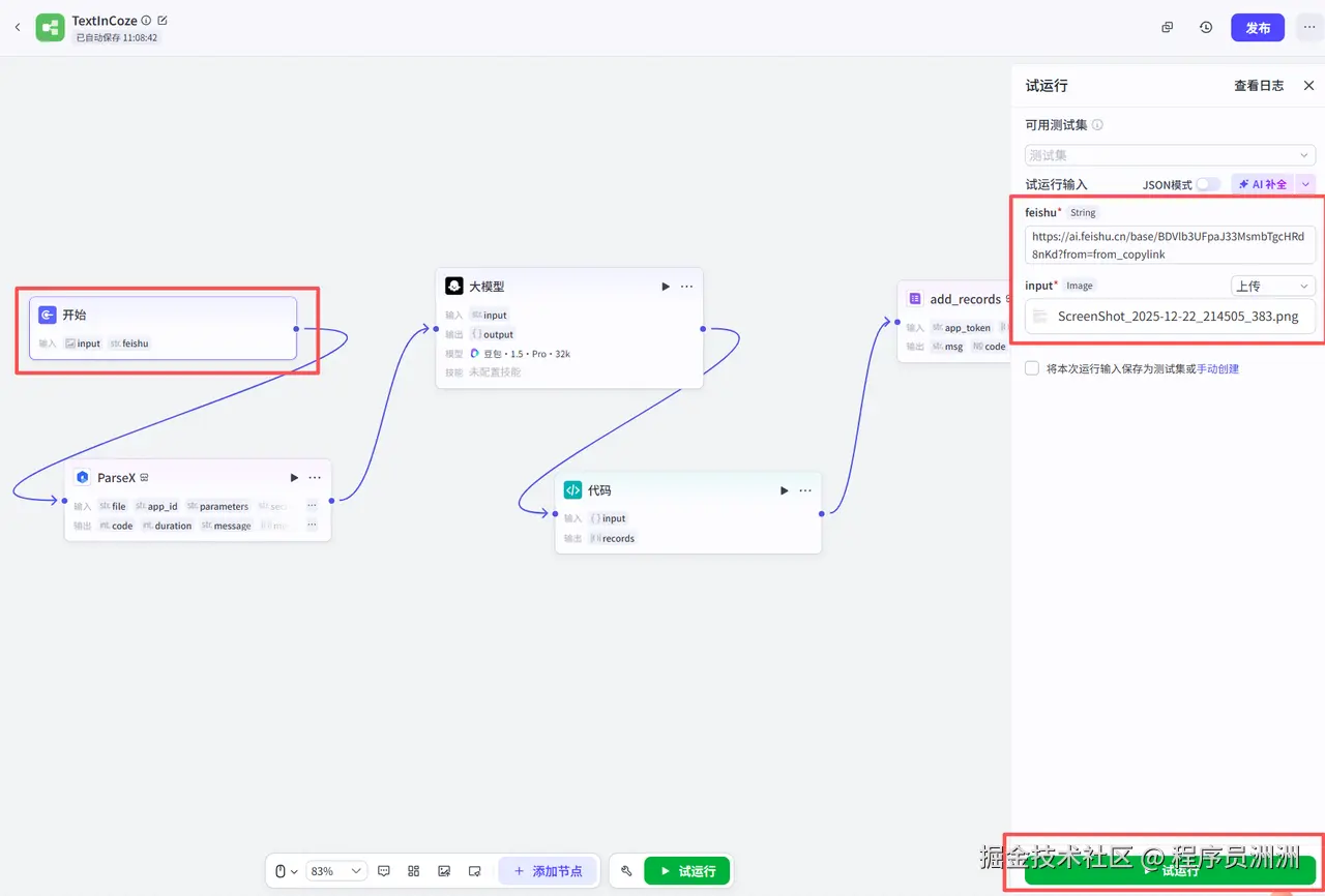 - 端到端流程完整性:从图片解析→字段提取→飞书表格输出的全链路流程,能验证 Coze 工作流的插件串联、数据传递是否无断点。