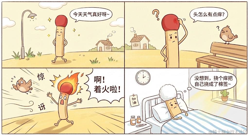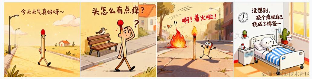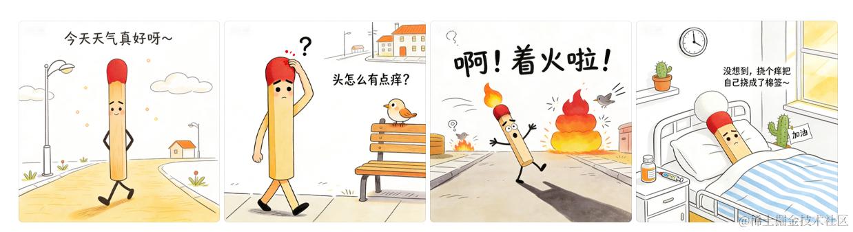 但技术文章更新的不是非常频繁,而公众号每天有一篇发文的机会。本着 不想浪费 的优良传统,在 AI 重塑一切的浪潮中,我想用 AI 画些四格漫画的笑话试试。于是开启了 慧心一笑 专栏, 《小火柴的倒霉日常》 就是第一篇,现在还没火。大家也可以点开看看,内容非常精简,就是一幅图+提示词。
