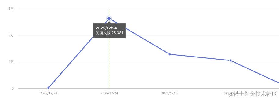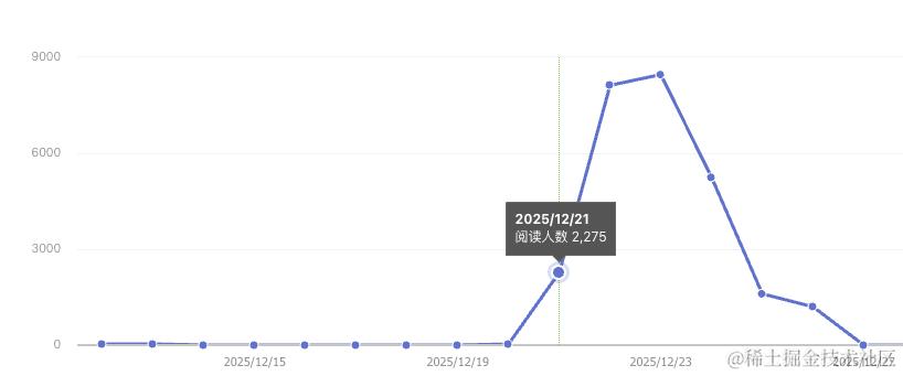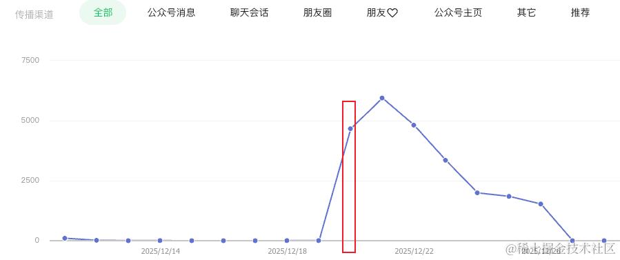 从数据统计来看,发布第一天只有 102 个浏览量,和往常没什么区别。持续一周,没有任何波澜,突然在 12-20 号,增加了近 5000 的浏览量,第二天持续上涨过万,然后逐渐平息: