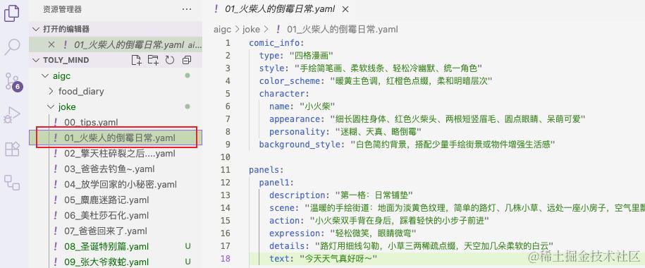 定义完结构,一个 yaml 文件就对应了一个四格故事,把这个内容丢给 AI 生图的工具,就能得到对应的图片。