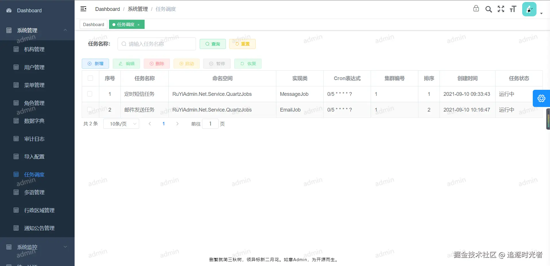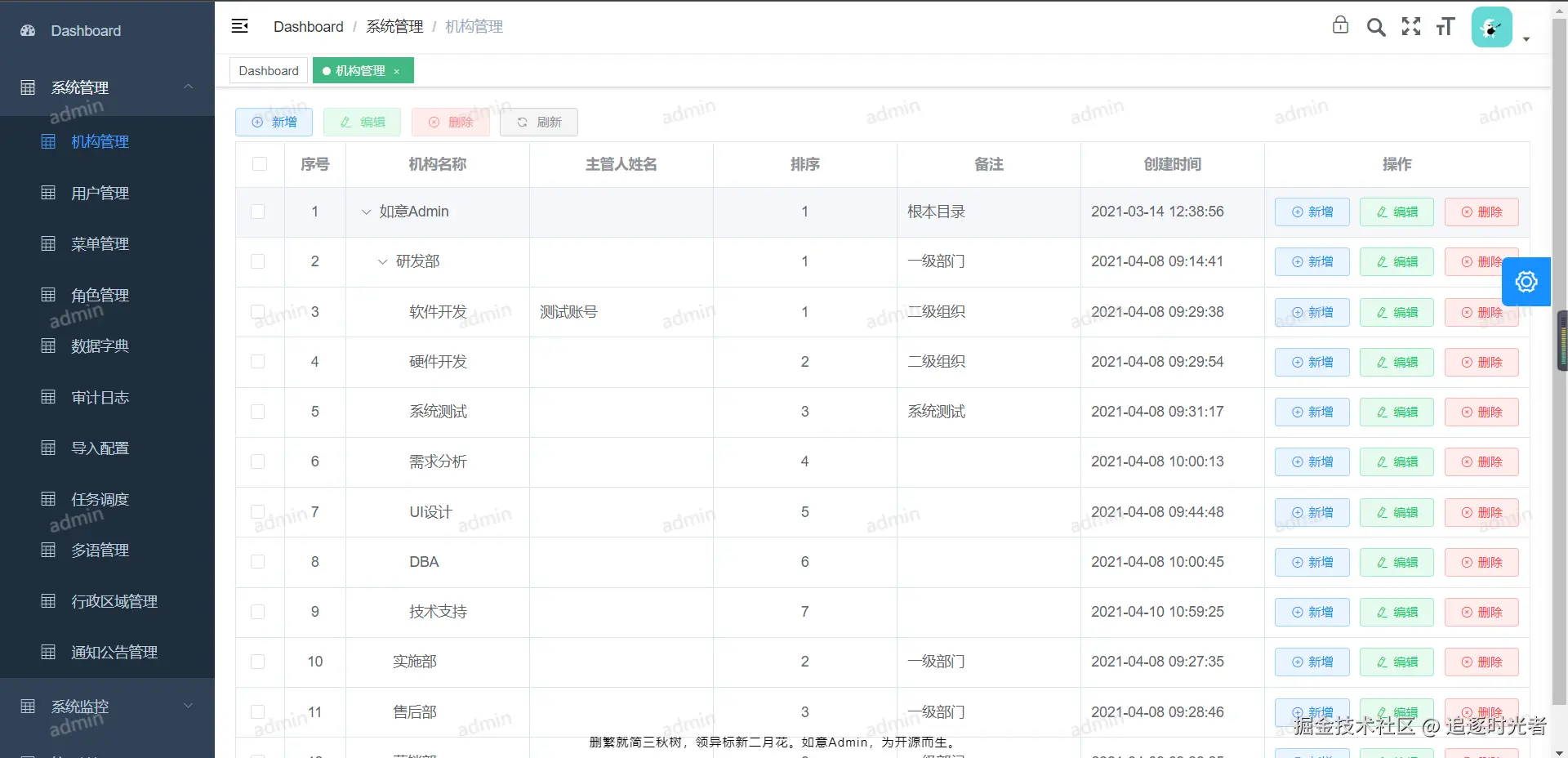 - 前后端分离: RuYiAdmin 采用前后端分离架构,前端基于VueElementAdmin,使用 Vue2 和 Element UI,后端基于 .NET 9 构建。