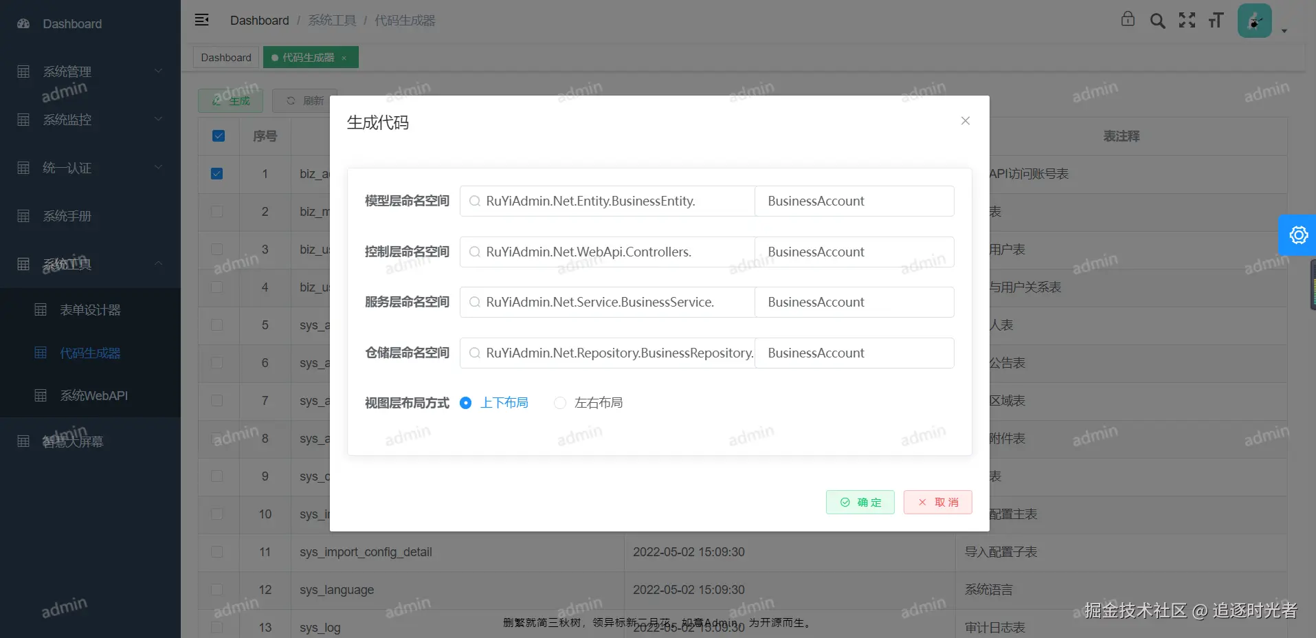 - 代码自动生成: 支持一键生成视图层、控制层、服务层、仓储层、领域层和 DTO 业务模型层代码,极大地缩短了开发周期。