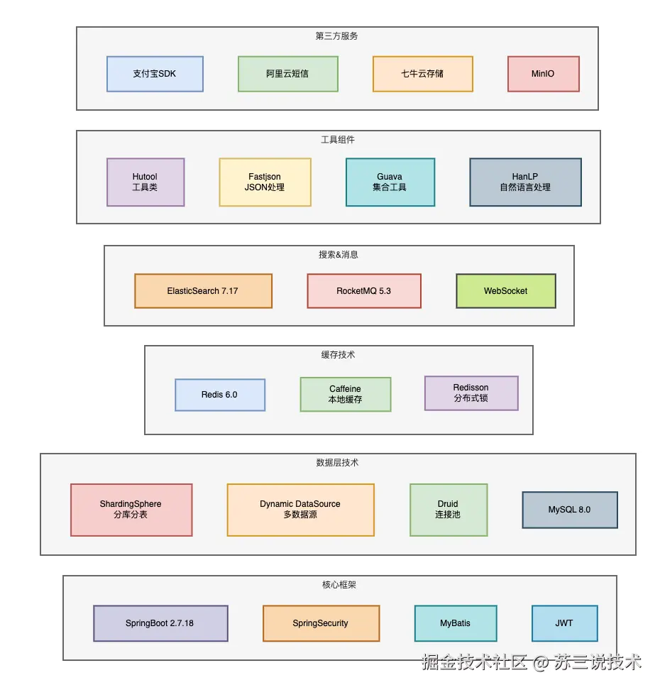 包含了各种业界常见的技术,比如:SpringBoot、SpringCloud、SpringCloud Alibaba、Mybatis、JPA、Redis、MongoDB、ElasticSearch、MySQL、PostgreSQL、Minio、Caffine、RocketMQ、Prometheus、Grafana、ELK、skywalking、Sentinel、Nacos、Redisson、shardingsphere、HikariCP、guava、WebFlux、nacos、Sentinel、WebSocket、Gateway、Nginx、Docker、Spring AI、Spring AI Alibaba等等,非常值得一看。