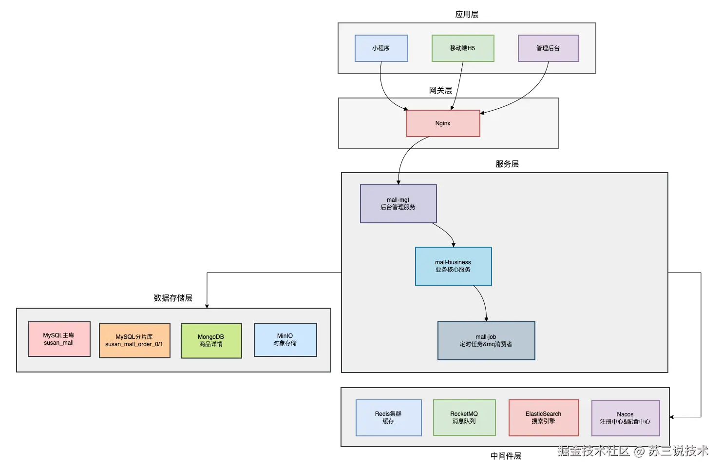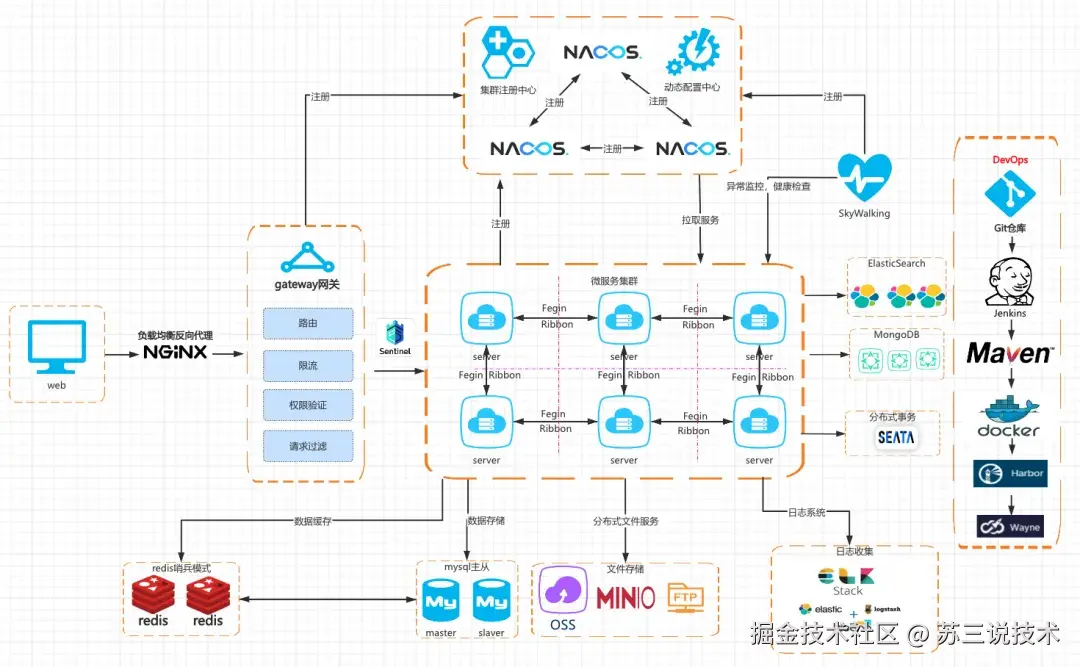- 中间件层:Redis集群、RocketMQ、ElasticSearch、Nacos(注册中间 & 配置中心)