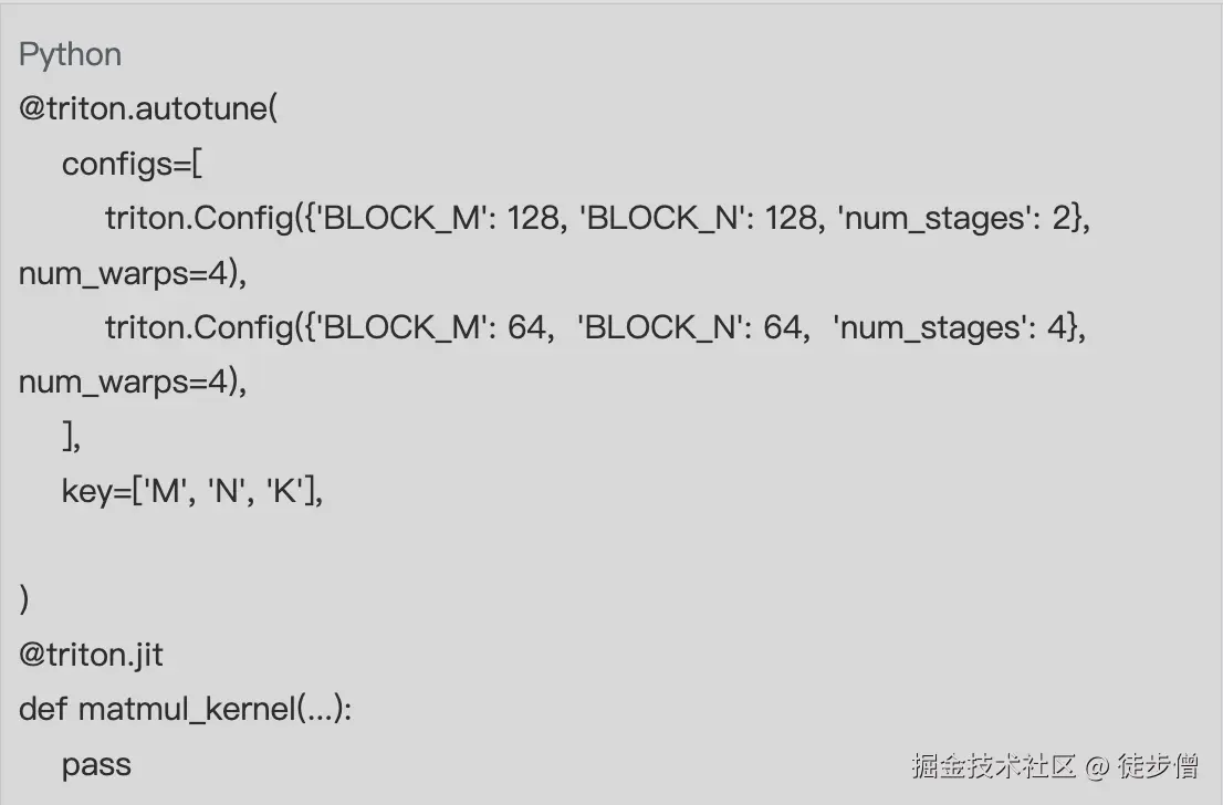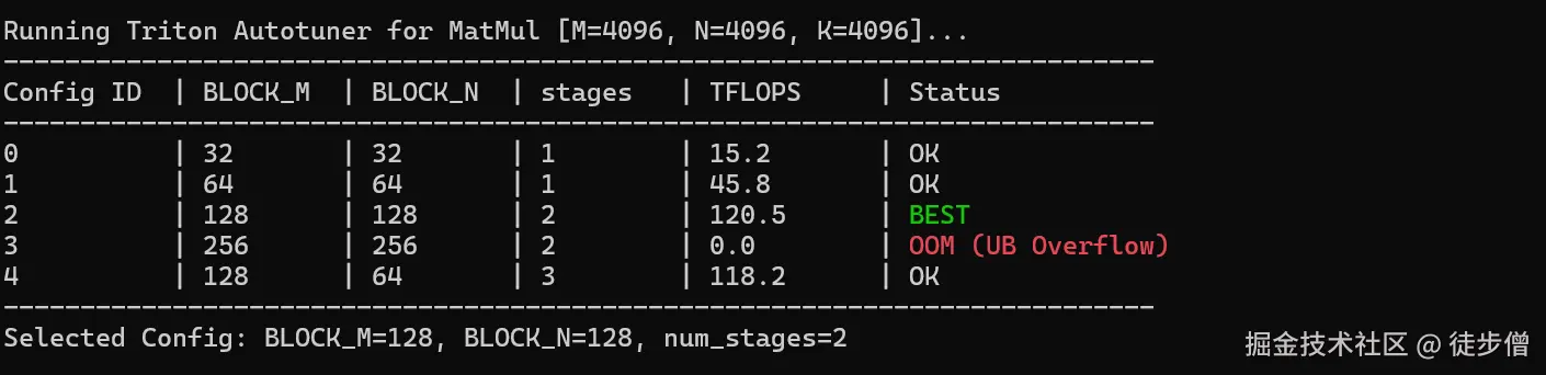 不同的 BLOCK_SIZE 和 num_stages 组合对性能影响巨大。手动尝试效率太低,我们可以利用 Triton 内置的 Autotuner。