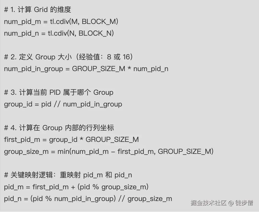 默认情况下,Triton 按照行优先(Row-Major)顺序调度 Block。这意味着它会处理完第一行的所有 Block,再处理第二行。然而,在矩阵乘法中,矩阵 B 的数据是被复用的。如果采用行优先调度,当处理第二行时,矩阵 B 的数据可能早已被挤出 L2 Cache,导致缓存未命中(Cache Miss)。