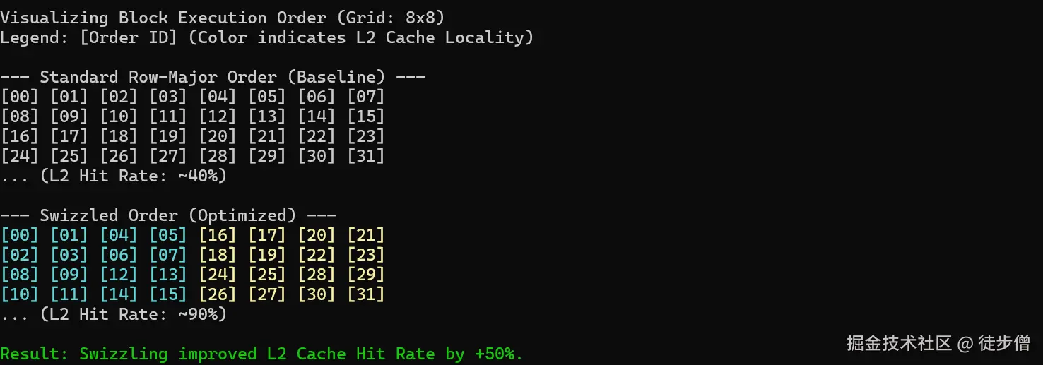 Swizzle 技术通过改变 Block 的执行顺序(通常改为 Z 字形或分块顺序),使得相邻执行的 Block 尽可能复用 L2 Cache 中的数据。