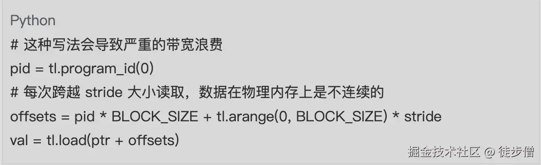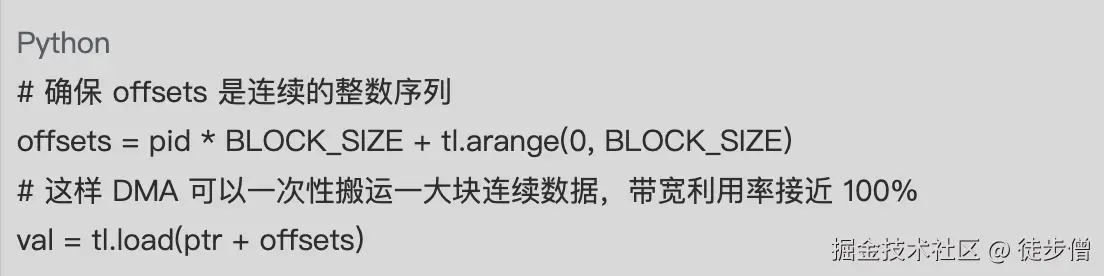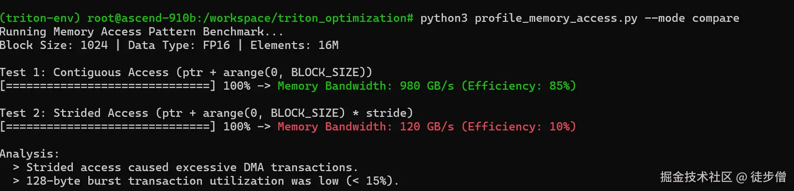 实测表明,在矩阵乘法(MatMul)算子中,将 Strided Access 优化为 Continuous Access,在 FP16 数据类型、Block 大小为 16×16 的条件下,往往能带来 约 5~8 倍 的有效带宽提升。