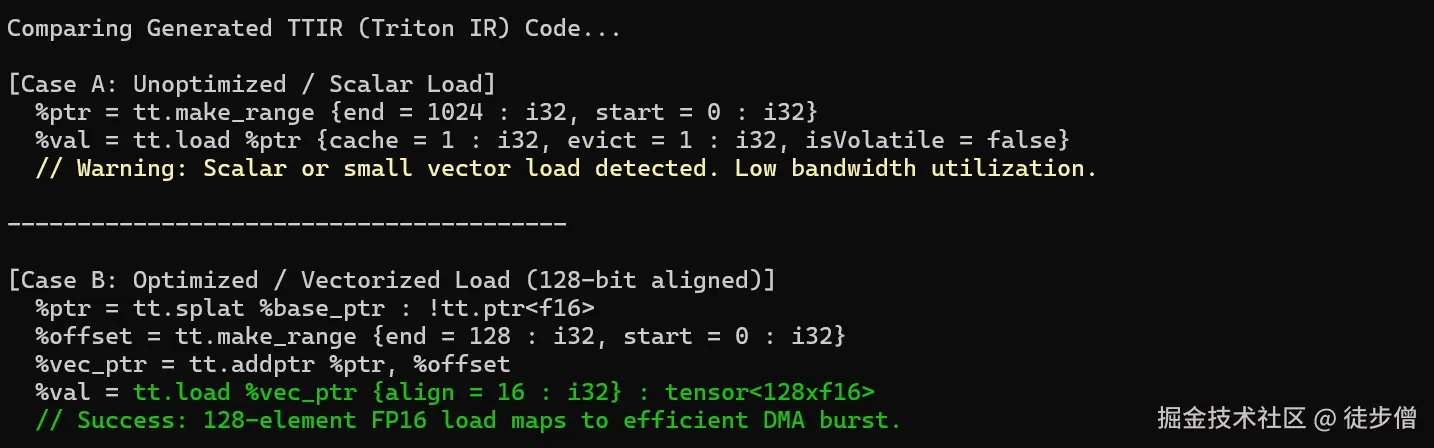 对于追求极致的开发者,查看生成的中间代码(IR)是必修课。通过检查生成的 TTIR(Triton IR),我们可以确认编译器是否正确识别了向量化加载指令。