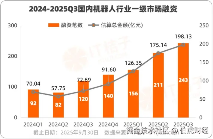 据IT桔子统计,2025年前三季度,国内机器人行业融资事件达到了610笔,较去年同期翻倍增长。进入下半年以来,融资事件更呈现加速增长的态势,仅第三季度就有243笔。