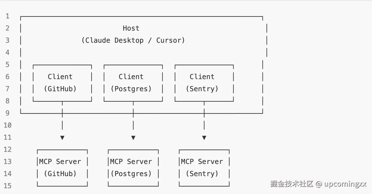 •Host:用户直接交互的应用(Claude Desktop、Cursor、Windsurf)