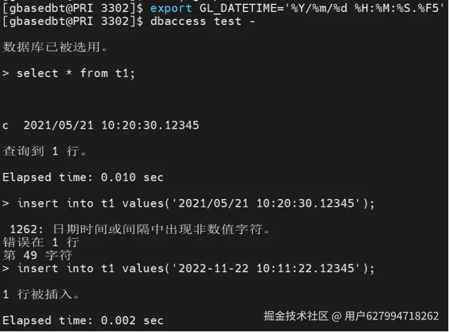 可见,dbaccess查询的结果集是按 GL_DATETIME 显示的,但是插入时不能按GL_DATETIME格式插入,必须 export USE_DTENV=1,才可以。