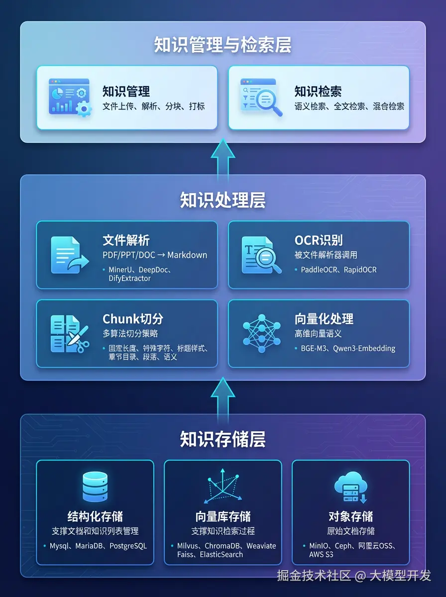 笔者结合项目落地经验,以及对RAGFlow、Dify、AnythingLLM等主流知识库产品的使用实践,从产品逻辑和技术架构层面,将RAG知识库产品抽象提炼为清晰的三层架构,进行一次系统性的解构分析。