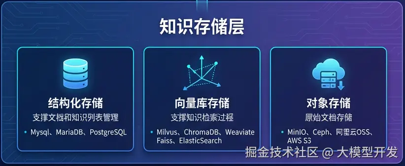 工程洞察: RAG知识库的架构复杂性在于,它并非单一数据库系统,而是必须协同工作的三种存储模式的集合。确保这三种存储之间的数据一致性和高可用性,是工程团队的首要挑战。