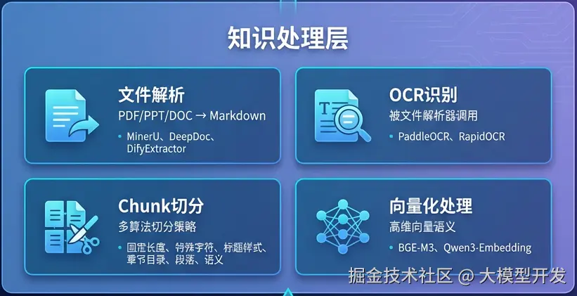 知识处理层是RAG系统进行“知识提炼”的核心引擎。它决定了知识分块(Chunk)的质量,直接影响最终的检索召回率和精准度。