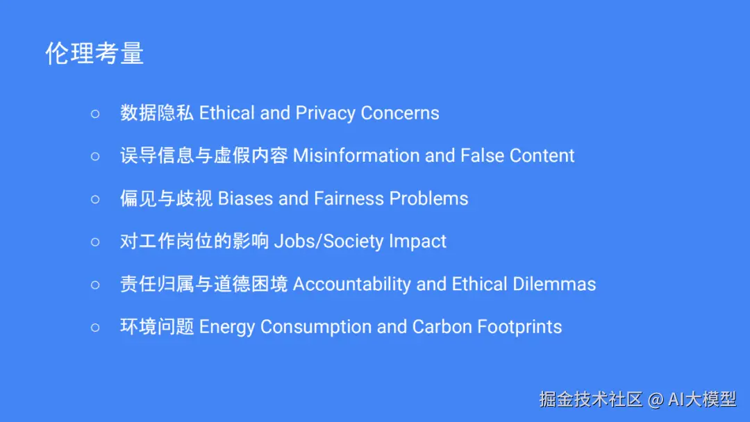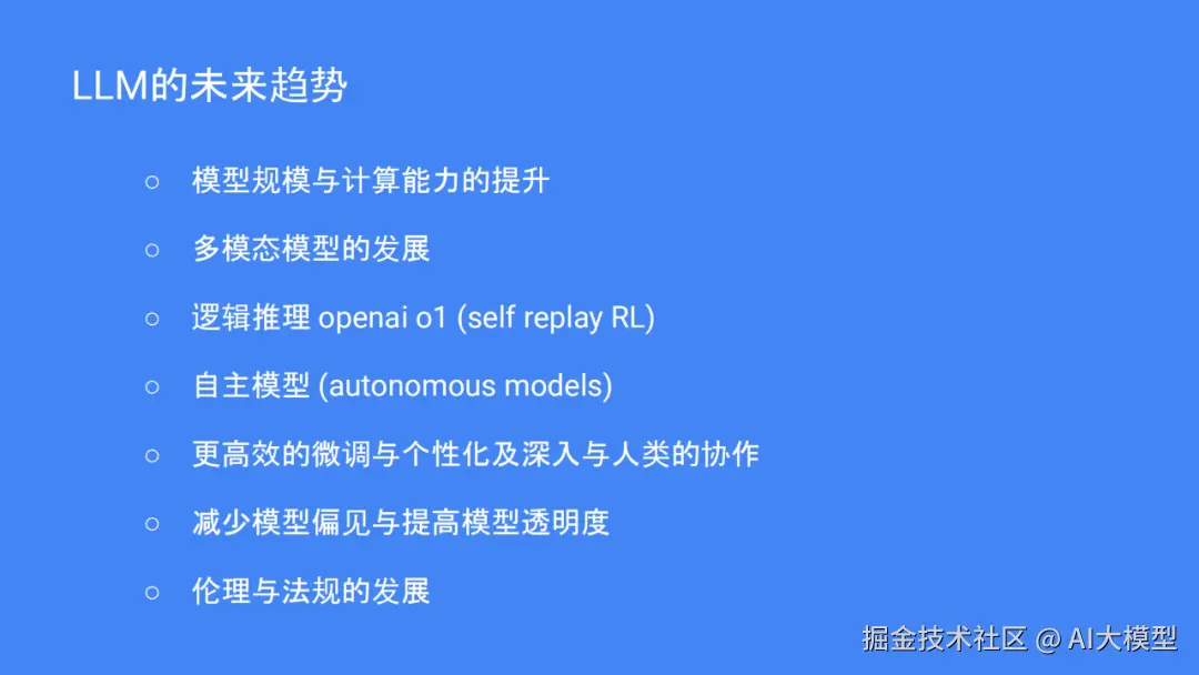 然而,使用 LLM需要考虑一些道德上的因素,例如保护数据隐私,避免产生虚假信息,降低模型偏差,以及 LLM的能源消耗并不小,会对环境造成一定的影响。未来, LLM将朝着多模式、强逻辑推理(OpenAIo1)、自治模型的方向前进,并且将更加有效地进行个性化的微调,更加密切地与人类进行合作,并且将逐渐完善相关的道德规范。