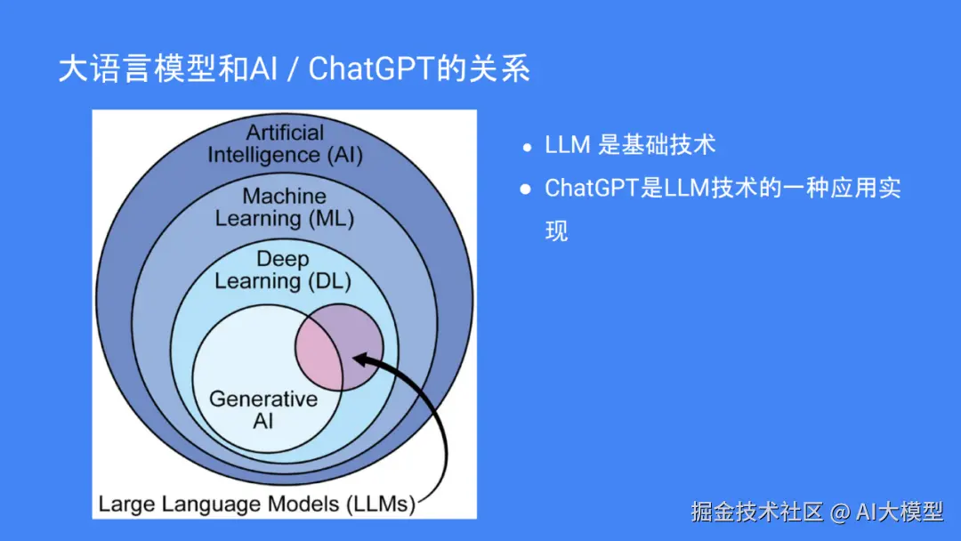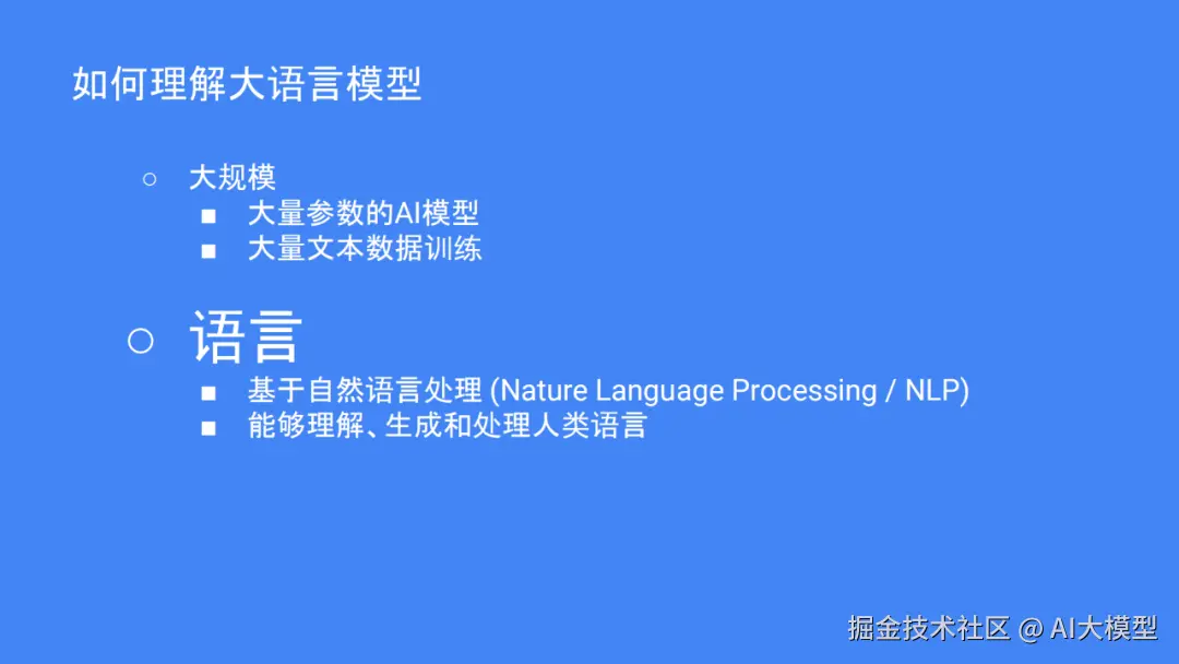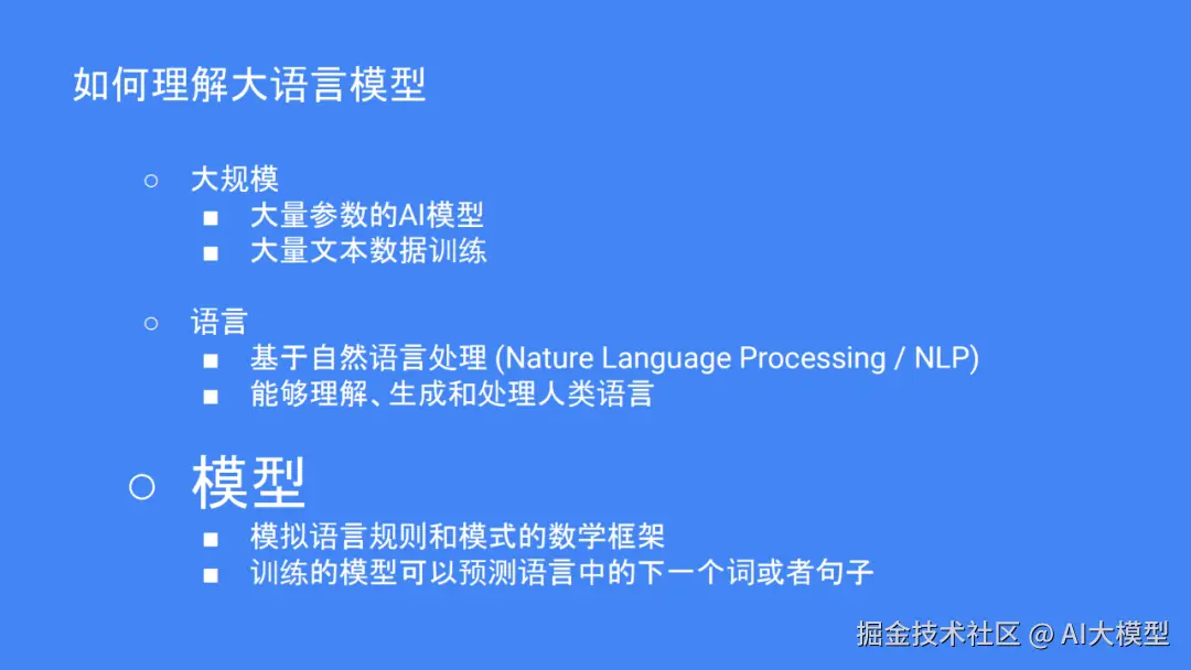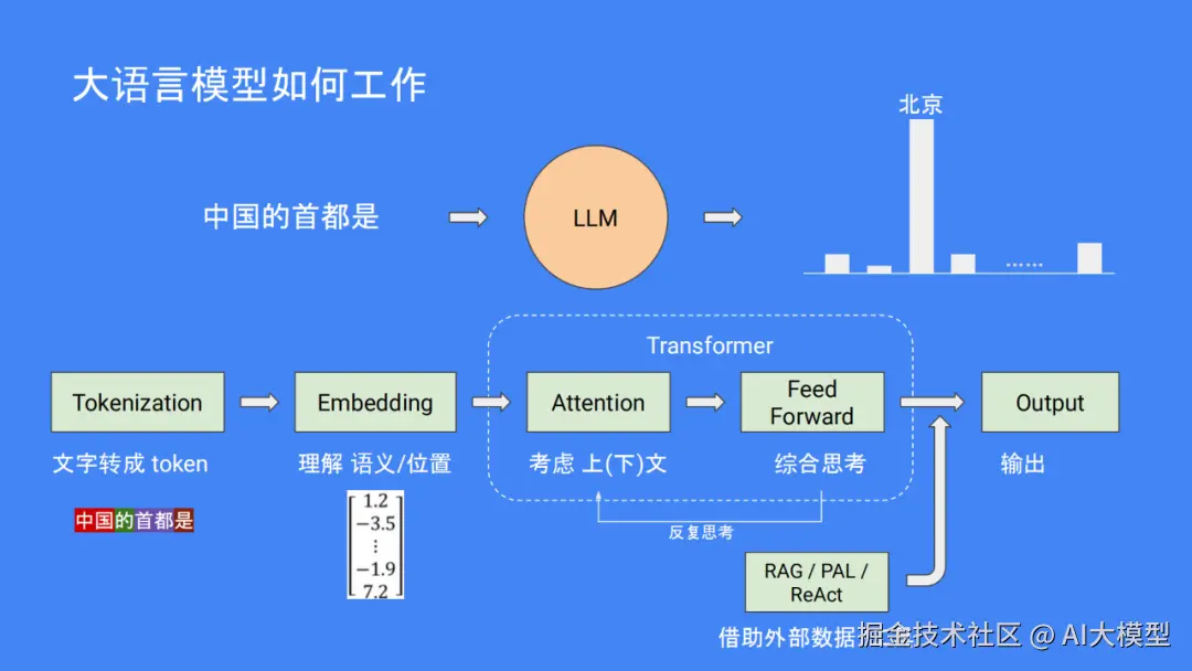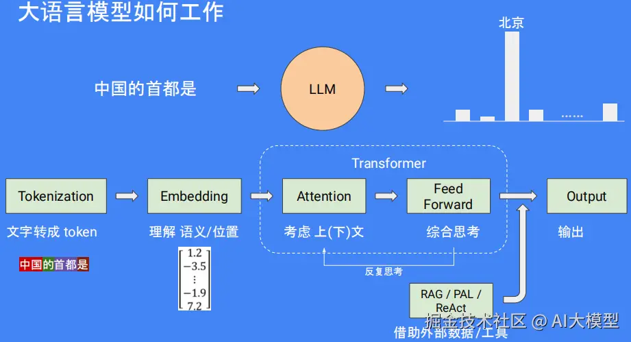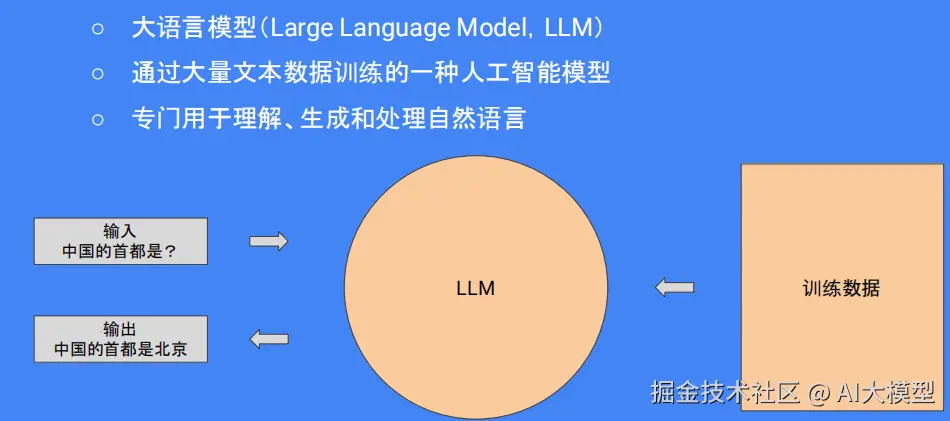 大语言模型(LLM),是一种能够理解并生成我们日常使用的语言的 AI工具。例如,如果你问中国首都的名字是什么?它的核心是通过大量的文本数据来“学”懂语言规则,并且能够预测接下来的单词和句子应该是什么,如“中国首都是北京。”