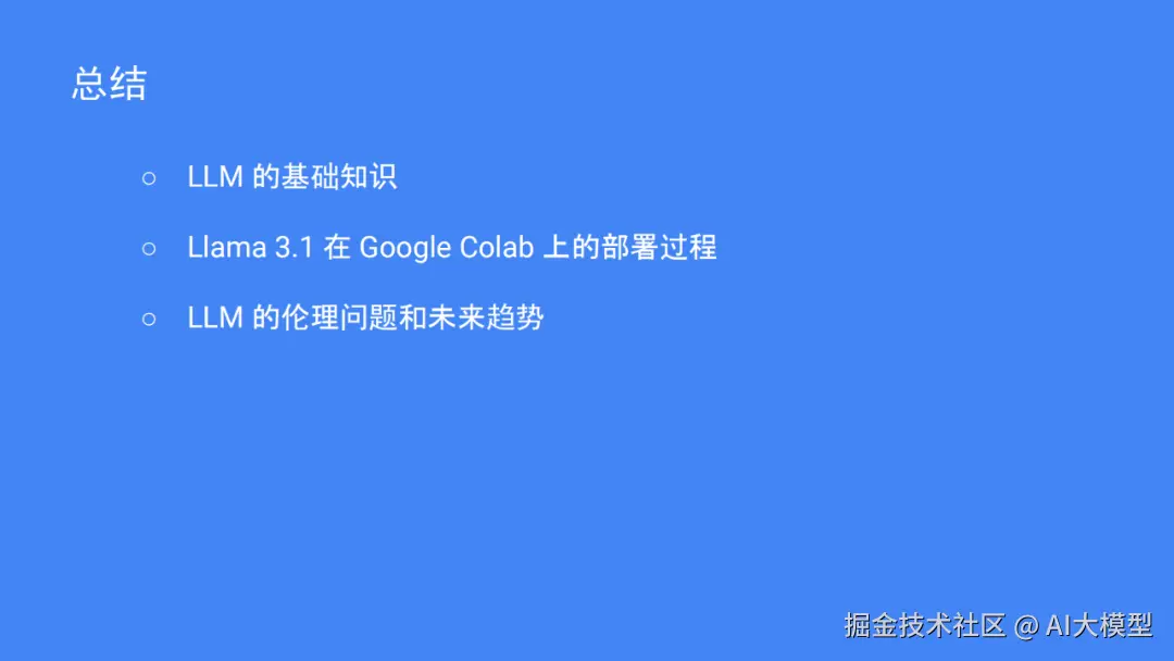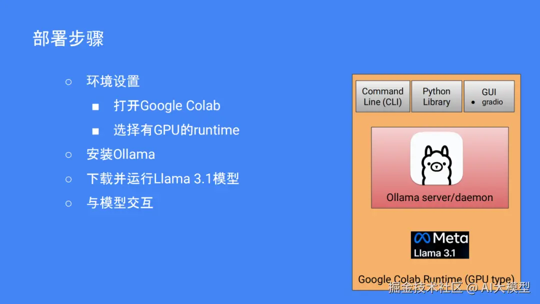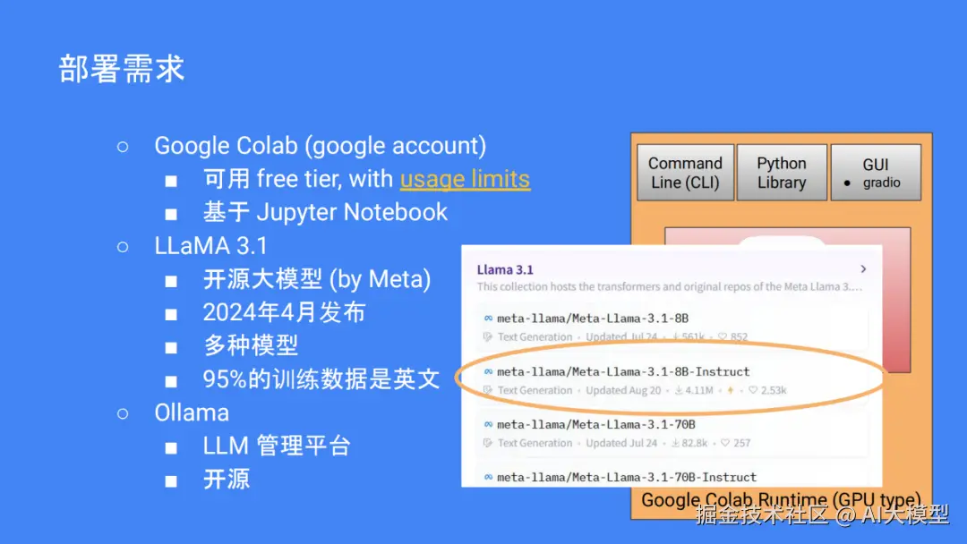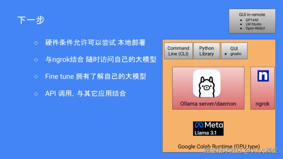 如果你想尝试自己部署,可以使用谷歌标签。Llama3.1是 Meta在去年的4个月开放的一个模型,虽然95%的训练数据都是用英文的,但是 Llama3.1有很多版本。再使用开放源码的 LLM开发平台 Ollama,流程也不是很复杂,打开 Colab,选择 GPU支持的环境、安装 Ollama、下载 Llama3.1、运行 Lllama3.1,然后就可以和模型进行交互。如果硬件不够好,也可以尝试在本地部署或与 ngrok一起进行远程接入。