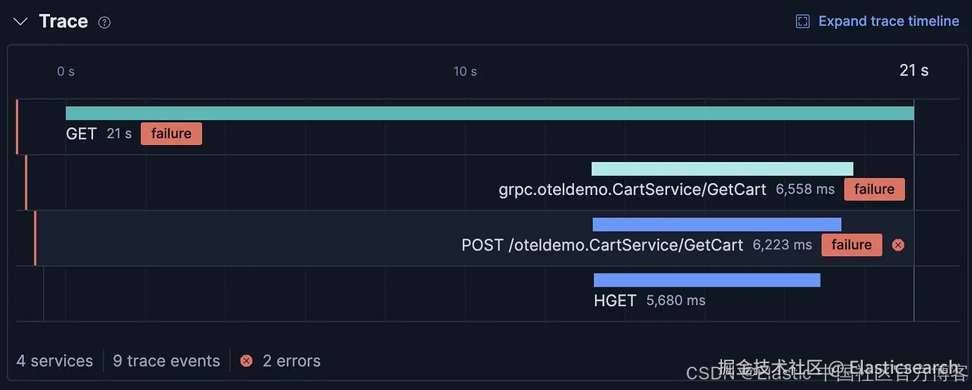 timeline 概览帮助你快速发现 trace 中的任何 errors,无需打开完整 trace 就能立即了解问题。