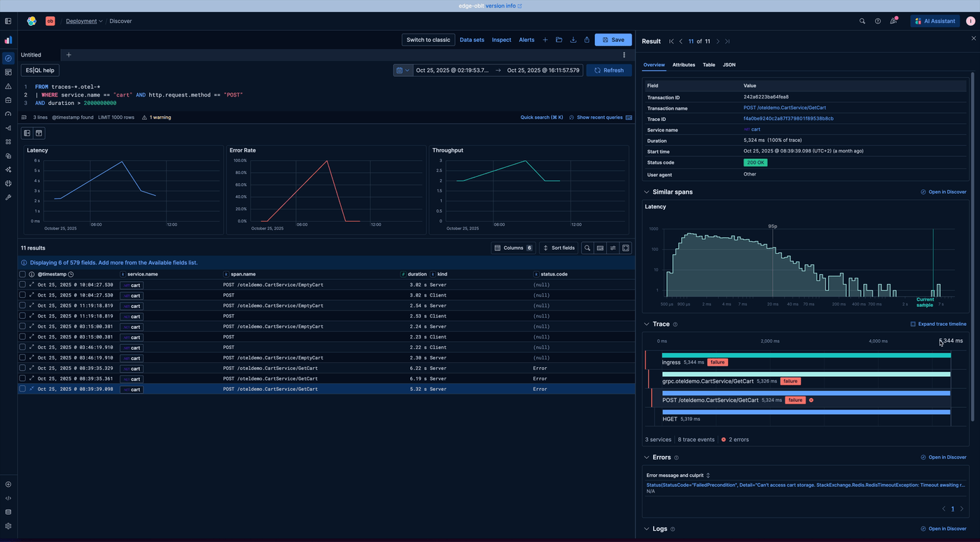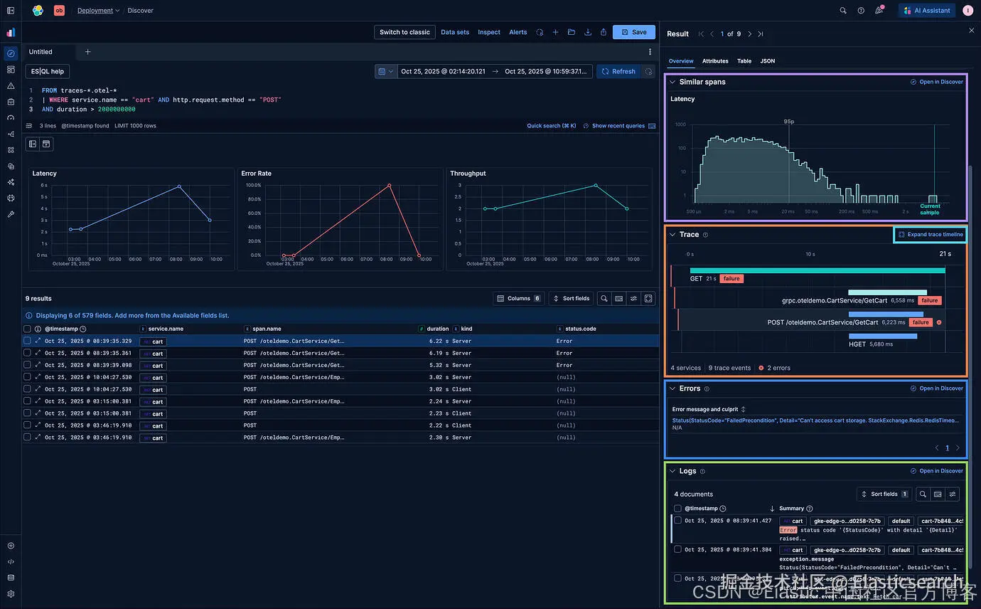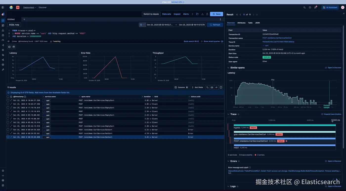 通过这些改进,在 Discover 中调查 traces 和性能问题从未如此快速或清晰。你可以在一个地方获取 spans、errors、logs 和 latency 模式的完整上下文。