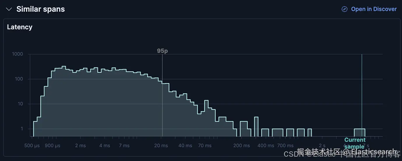 使用 latency 分布曲线来了解该 span 相对于其他相似 spans 是更快还是更慢。你还可以点击在 Discover 中打开所有相似的 spans,以进行更深入的分析。