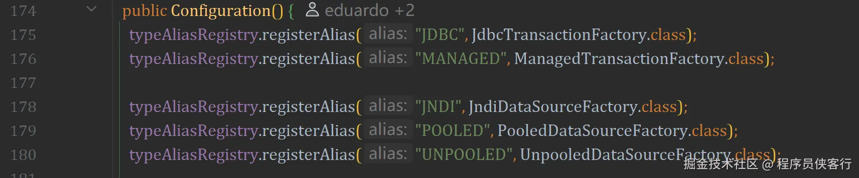 创建Configuration对象时,默认注册了mybatis框架自身需要的一些别名。这也是能配置如的原因。