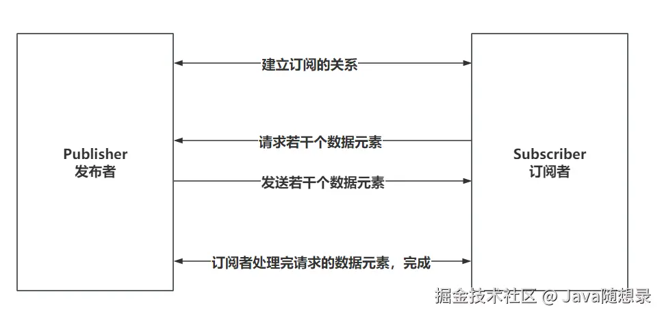 Subscription:发布者和订阅者是基于 Subscription 关联的。当建立了订阅的关系后,发布者会将 Subscription 传递给订阅者。订阅者指定获取元素的数量和取消订阅操作,都要基于 Subscription 去操作。提供了两个方法: