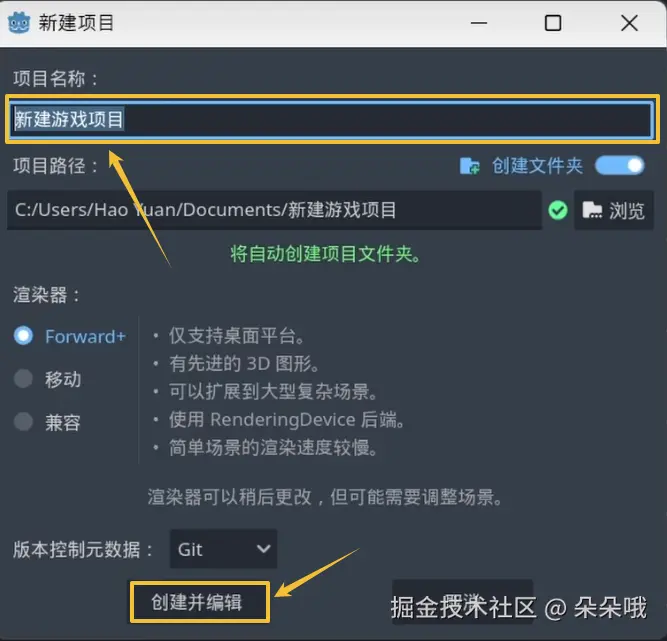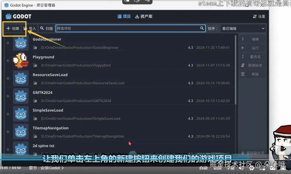 从项目名称写你的名称,再点击创建并编辑,Godot就会打开我们新项目的编辑器菜单了.