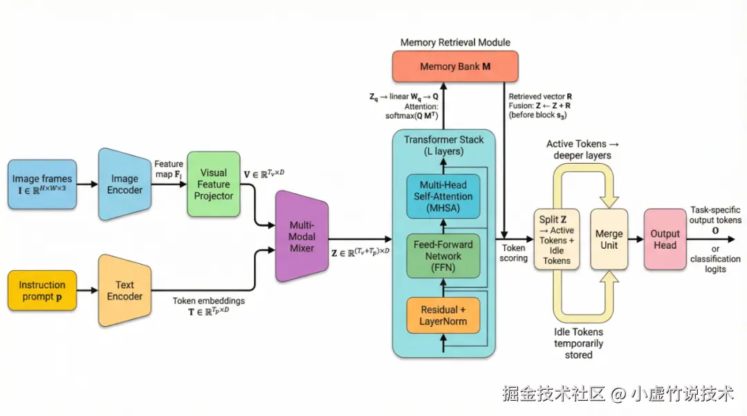 双流输入的 Multi-modal Mixer、分层的 Memory Retrieval、Active / Idle Routing 的分叉路径…… 它不只是把结构摆清楚,还顺手对齐了那种顶会标配的审美:清爽、扁平、不用力过猛。