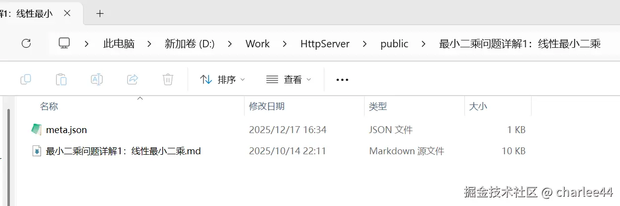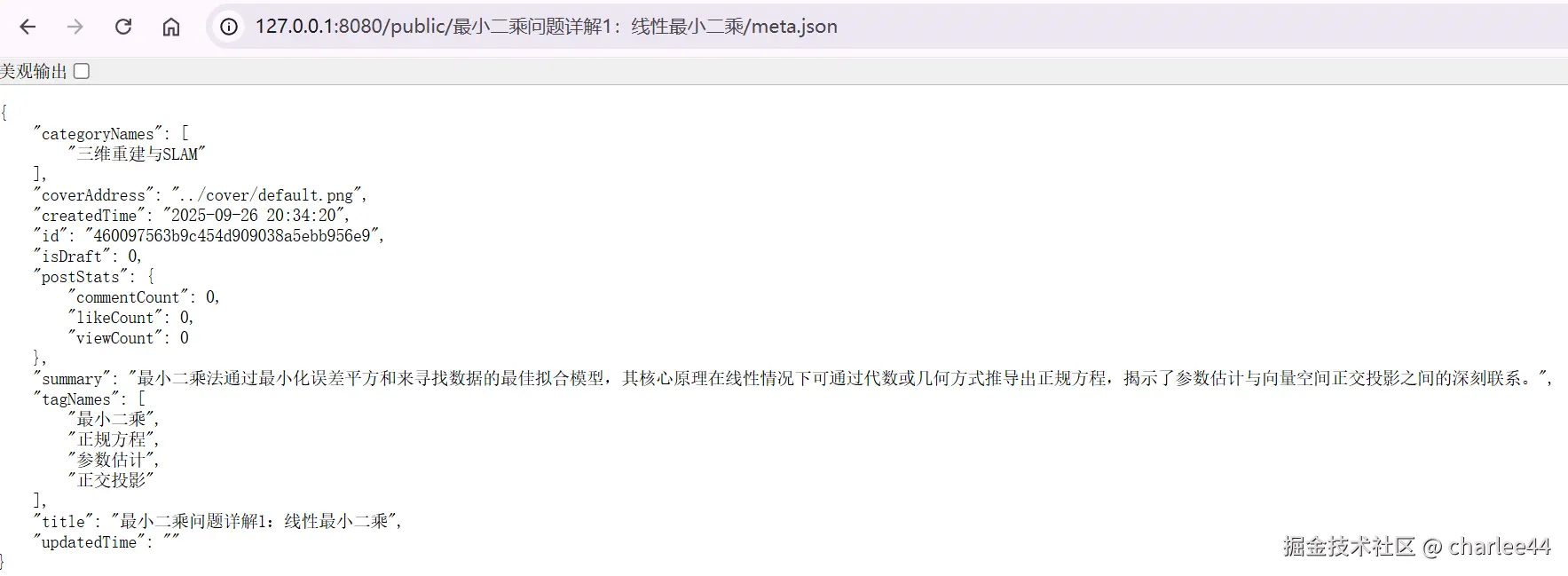 那么可以在浏览器通过 URL 地址 http://127.0.0.1:8080/public/最小二乘问题详解1:线性最小二乘/meta.json 访问到具体的文件内容:
