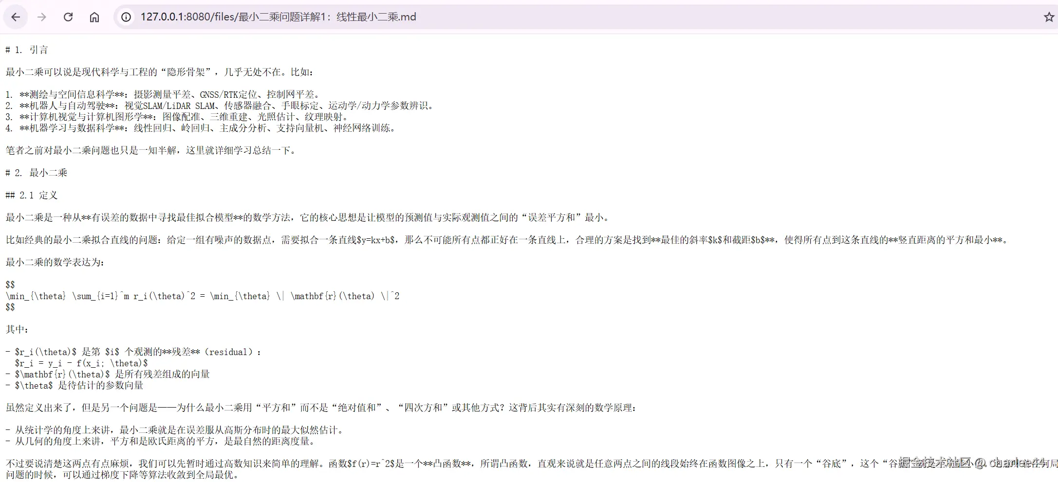 如果我们在浏览器地址访问http://127.0.0.1:8080/files/最小二乘问题详解1:线性最小二乘.md,就可以看到最小二乘问题详解1:线性最小二乘.md这个文件的内容: