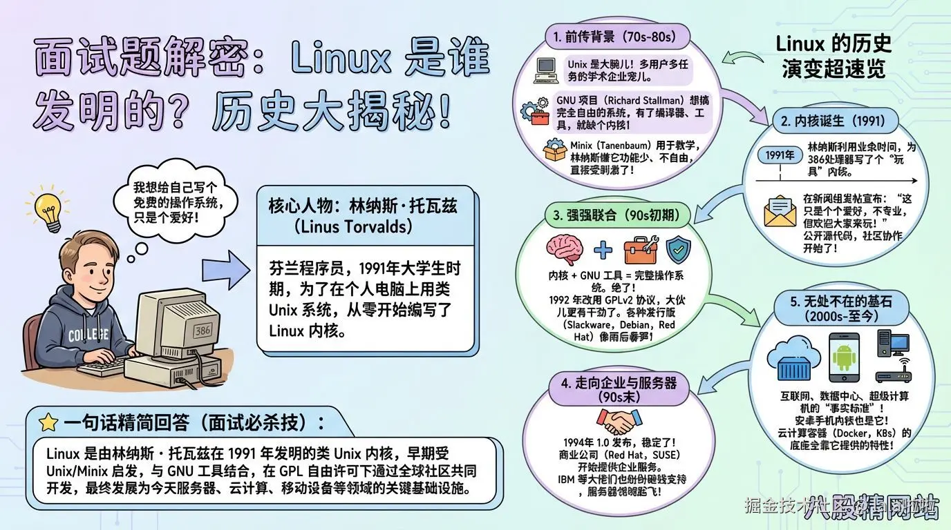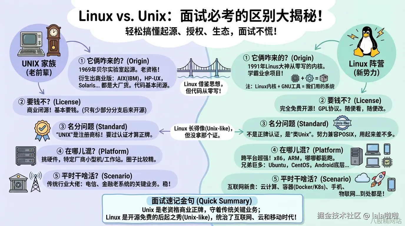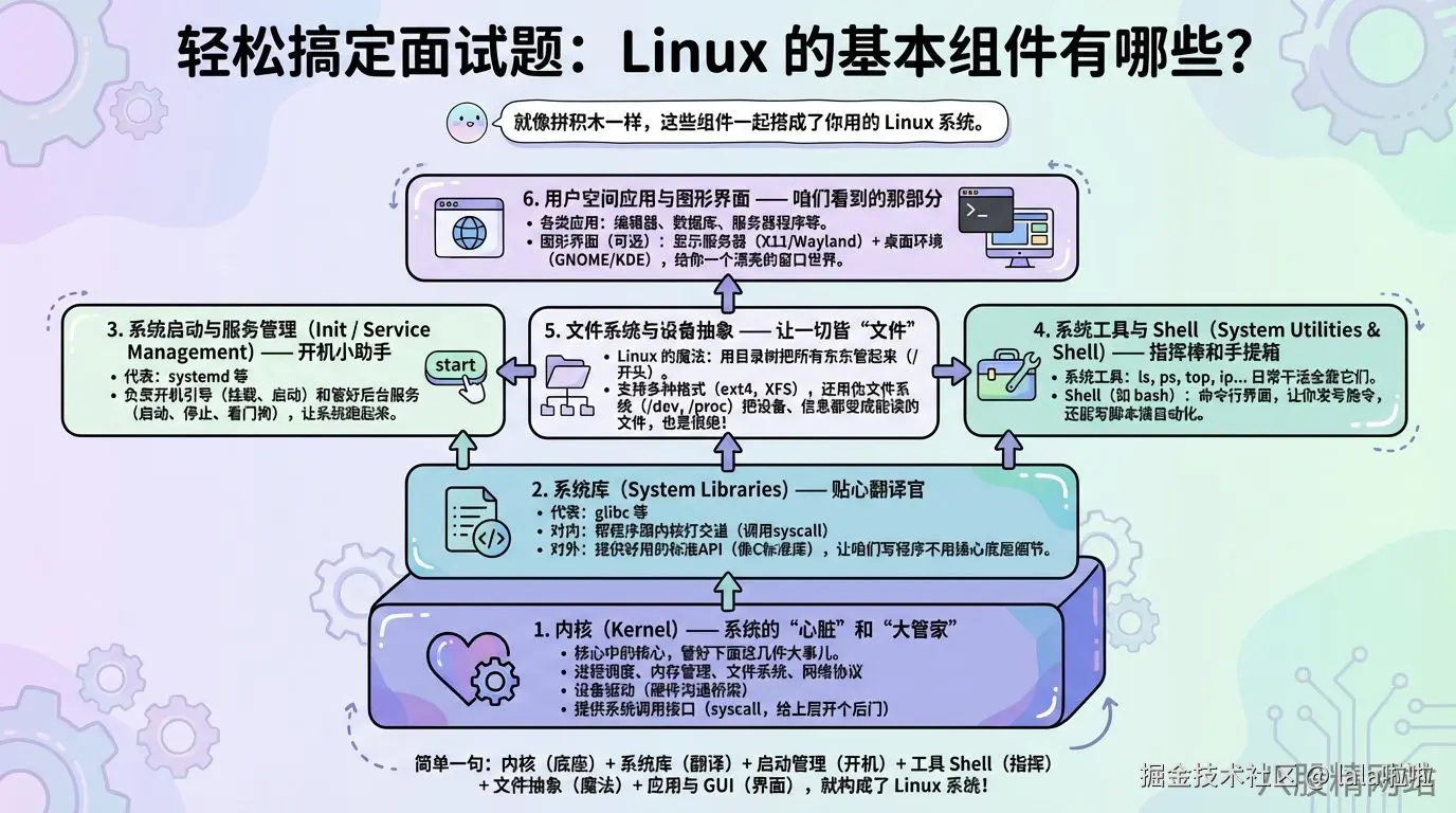 Linux面试题图解 lala啦啦 2025-12-28 15 阅读1分钟 一、简述CPU 负载很高,利用率却很低该怎么办? 二、谁发明了Linux?解释Linux的历史? 三、Linux和Unix有什么区别? 四、Linux的基本组件是什么? 五、环境变量是什么? 六、什么是符号链接? 七、什么是僵尸进程? 八、简述Linux 内核 IO 模型 ?