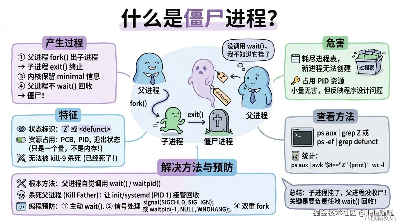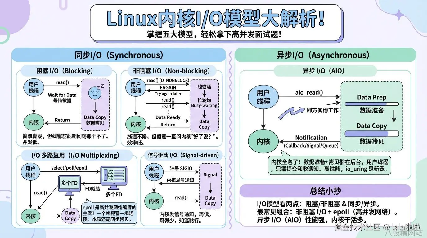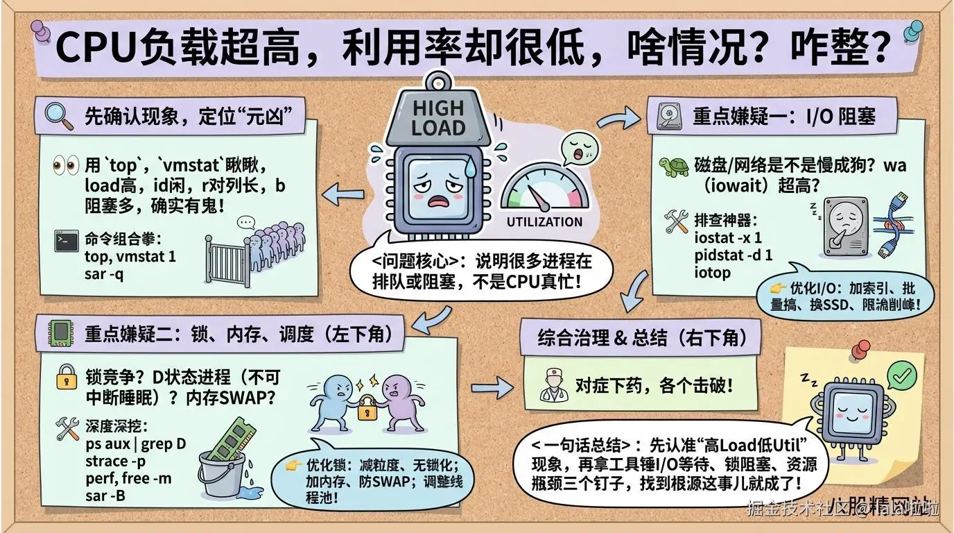Linux面试题图解 lala啦啦 2025-12-28 15 阅读1分钟 一、简述CPU 负载很高,利用率却很低该怎么办? 二、谁发明了Linux?解释Linux的历史? 三、Linux和Unix有什么区别? 四、Linux的基本组件是什么? 五、环境变量是什么? 六、什么是符号链接? 七、什么是僵尸进程? 八、简述Linux 内核 IO 模型 ?
