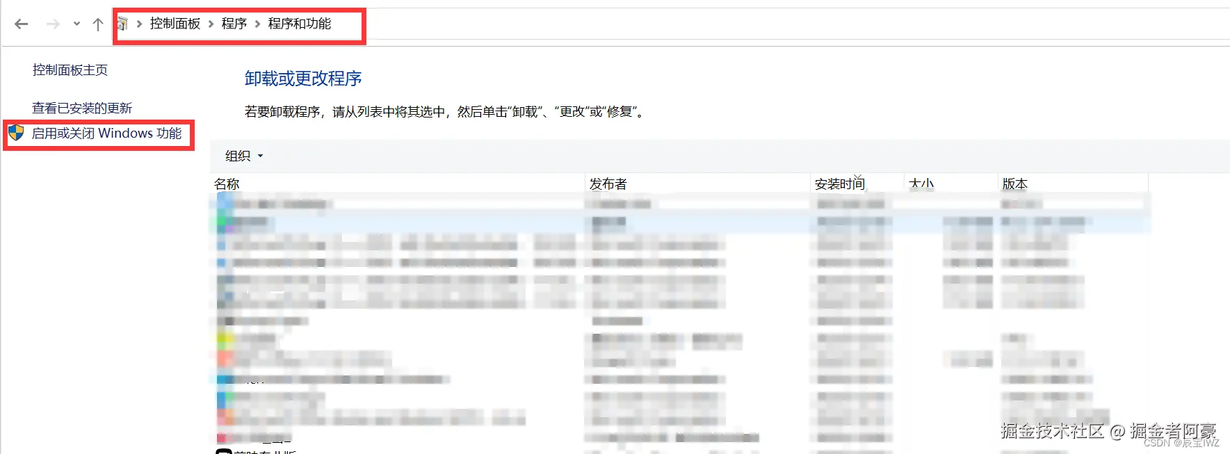 打开控制面板,在程序与功能页面选择启用或Windows功能