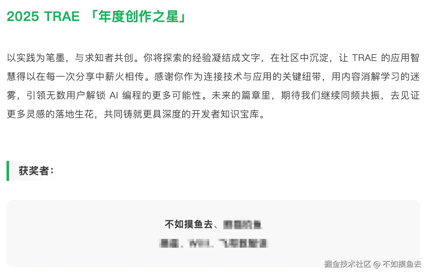 12 月 27 号,获得了 TRAE 2025 年度五大用户奖——年度创作之星,感谢 TRAE。