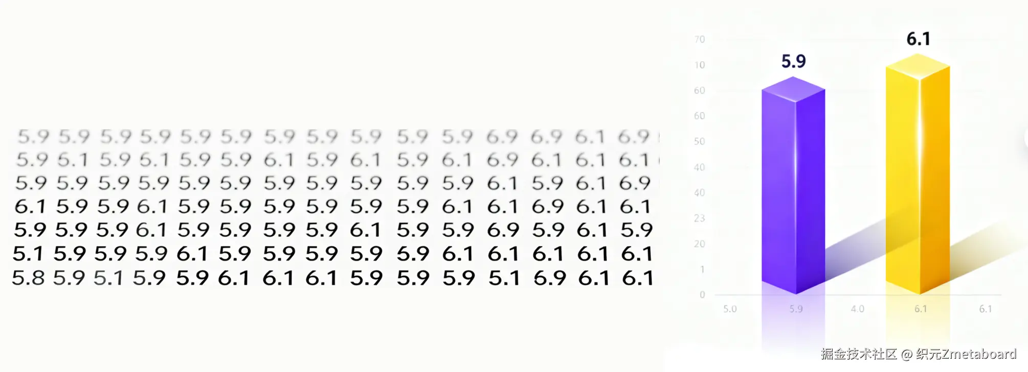 什么意思呢? 给你看一张写满 1000 个“5.9”和“6.1”的表格,你很难一眼找出哪个更大。但如果把它们变成一高一低的柱状图,你的大脑根本不需要思考,视神经会在几毫秒内告诉你答案。
