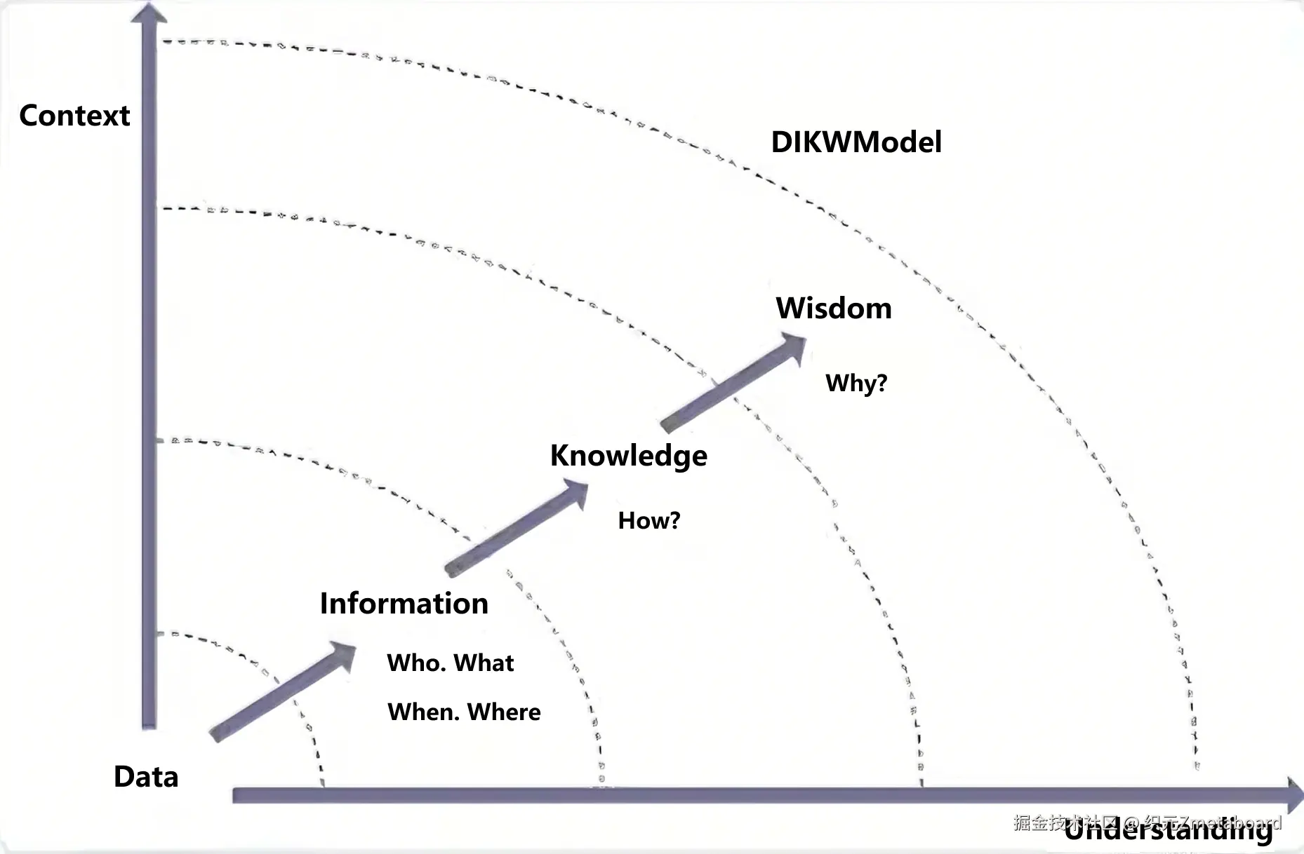 在信息科学中,有一个著名的 DIKW 模型:Data(数据) -> Information(信息) -> Knowledge(知识) -> Wisdom(智慧)。