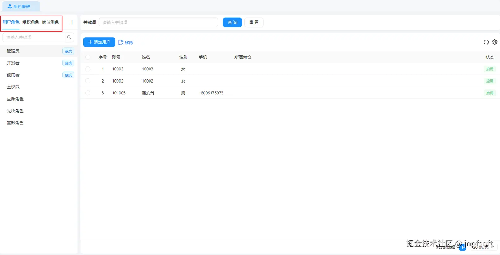 角色管理支持创建用户角色、组织角色、岗位角色,用于给用户、组织、岗位赋予权限,增加权限的灵活性