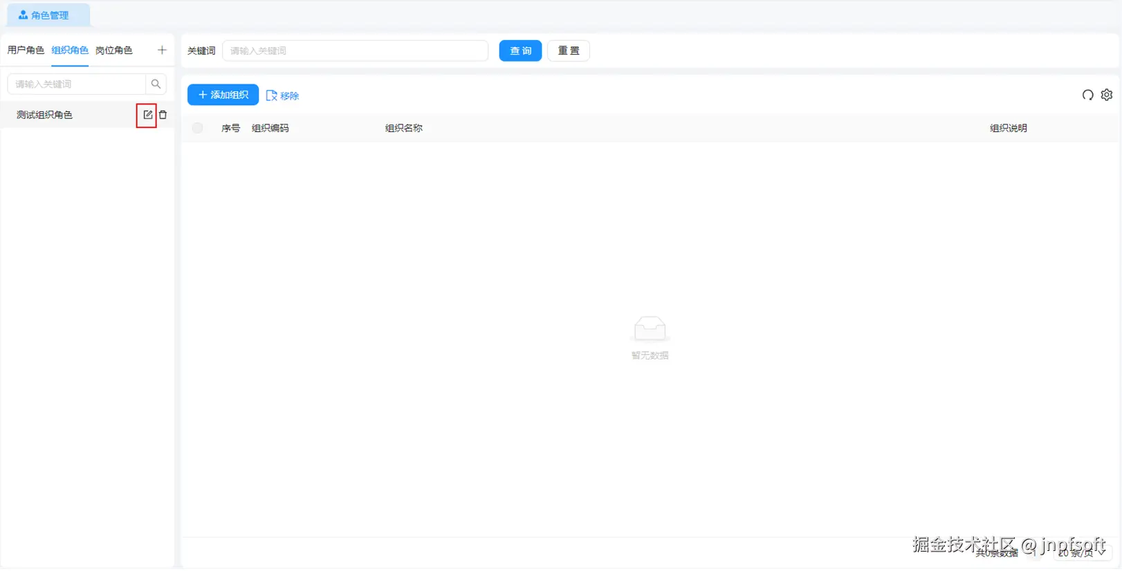 - 鼠标悬浮于组织角色上,显示编辑和删除按钮