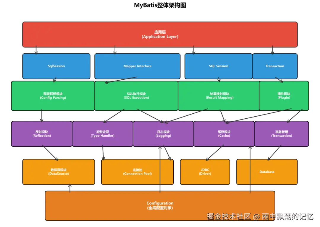 在深入配置解析模块之前,我们先来看MyBatis的整体架构。MyBatis作为一个优秀的持久层框架,采用了分层设计思想,将整个框架划分为多个功能模块,各司其职又协同工作。