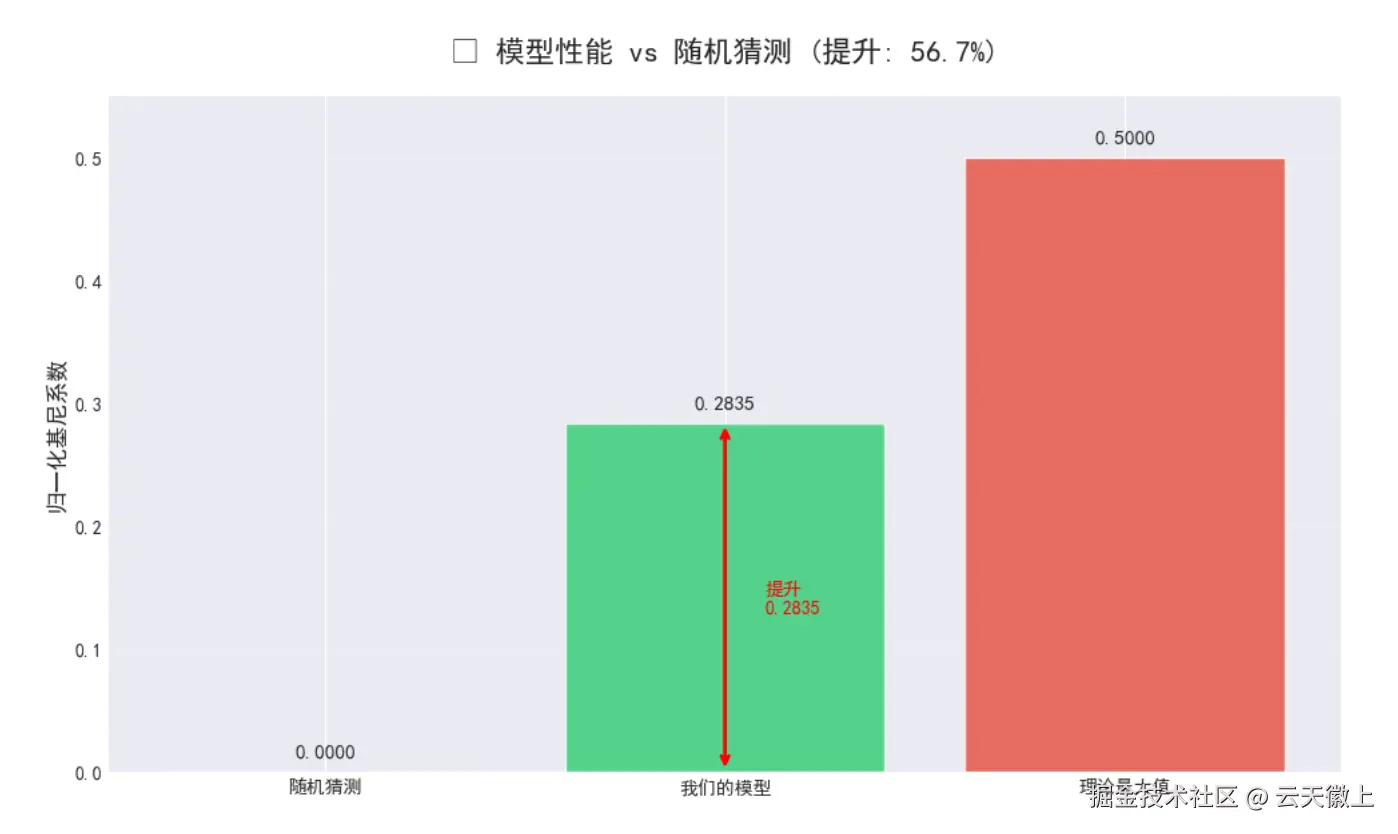ax.set_title(f'🎯 模型性能 vs 随机猜测 (提升: {(overall_gini/0.5)*100:.1f}%)',