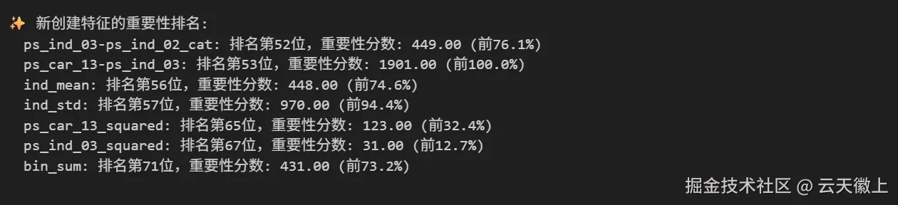# 基于业务理解创建交互特征 train['ps_ind_03-ps_ind_02_cat'] = train['ps_ind_03'] * train['ps_ind_02_cat'] train['ps_car_13-ps_ind_03'] = train['ps_car_13'] * train['ps_ind_03'] -