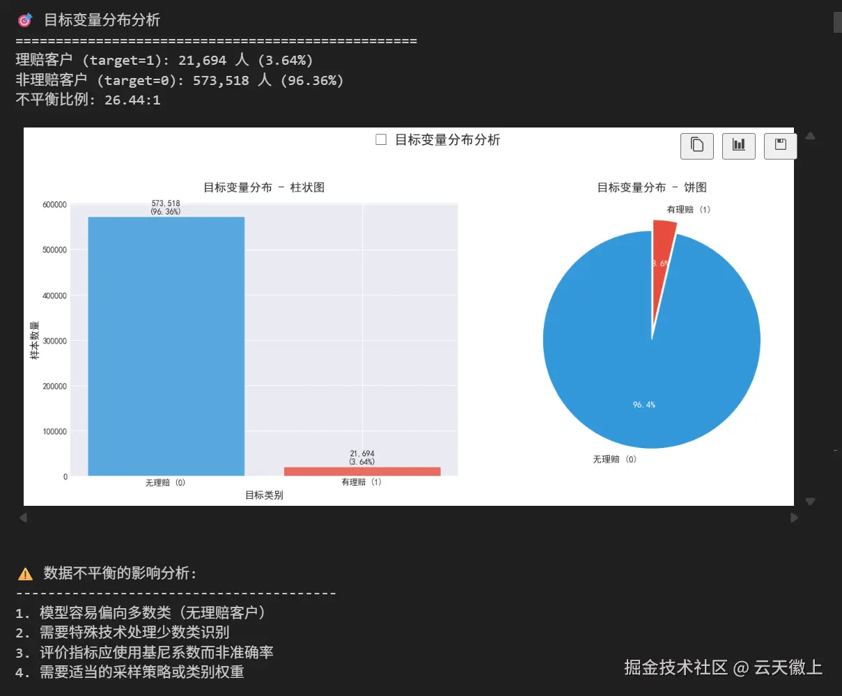 print(f"非理赔客户 (target=0): {target_counts[0]:,} 人 ({target_percentages[0]}%)")