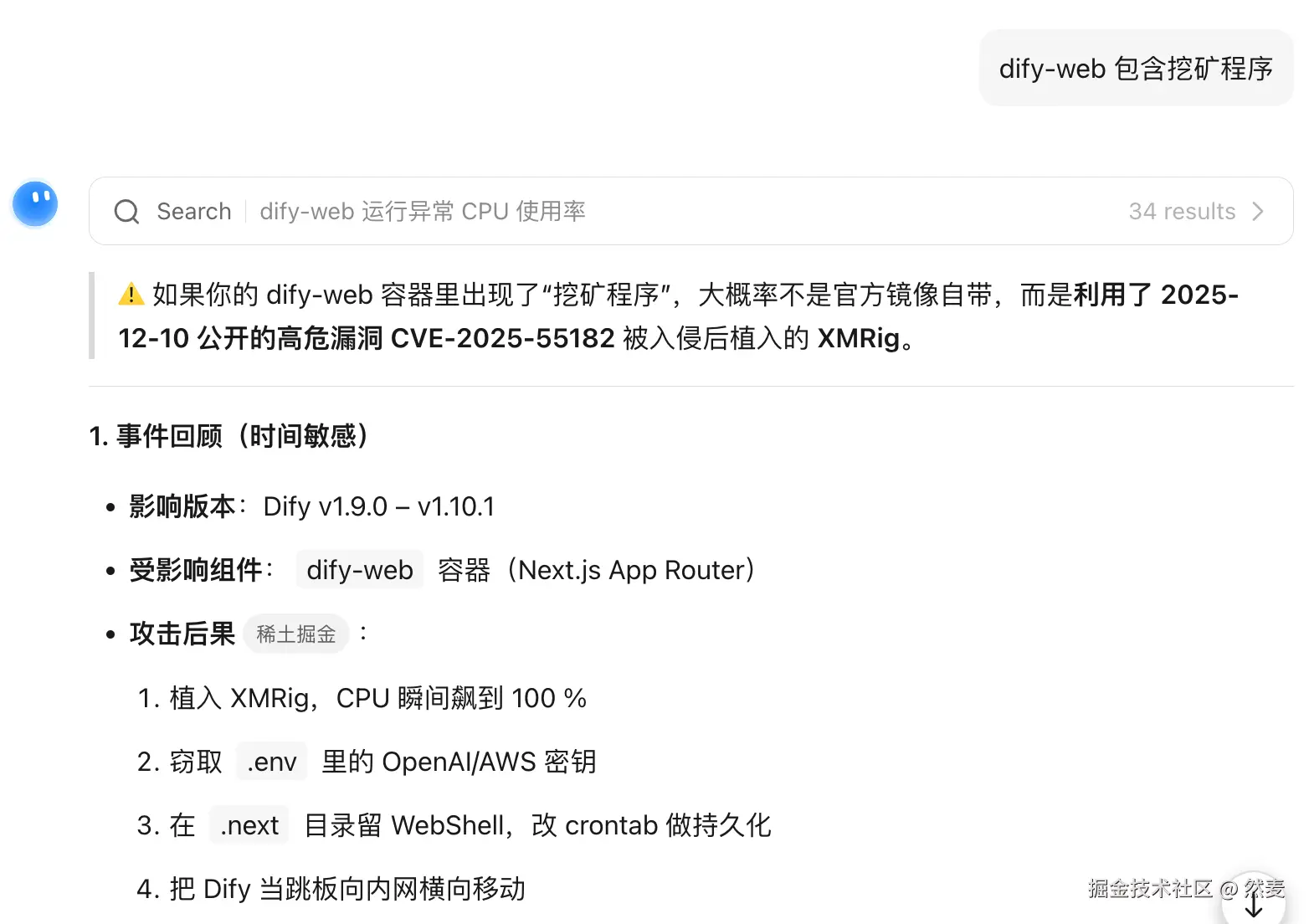 难道 dify-web 包含挖矿进程,是下载的扩展插件引入的吗?继续问一下 AI