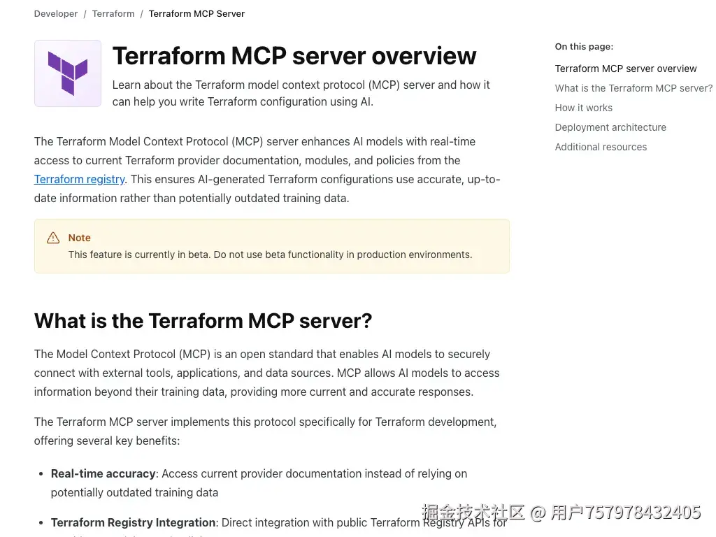 HashiCorp 官方发布的 Terraform MCP 服务器,为 Terraform 配置管理引入了 MCP 支持。该服务器让 AI 模型实时访问 Terraform Registry 中提供商的文档、模块和策略,从而生成准确的 Terraform 配置,而不是依赖过时的训练数据。HashiCorp 文档指出,Terraform MCP 服务器集成了公共 Registry 的 API,支持查找模块输入输出、引用 Sentinel 策略,并且可以管理 Terraform 云(HCP/TFE)组织和工作区。