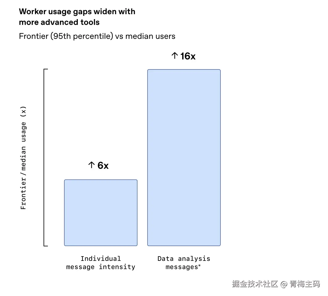 前沿员工(使用强度前 5%)发送消息量是中位员工的6倍,在数据分析任务上甚至达16倍。编码任务差距最大,达17倍。
