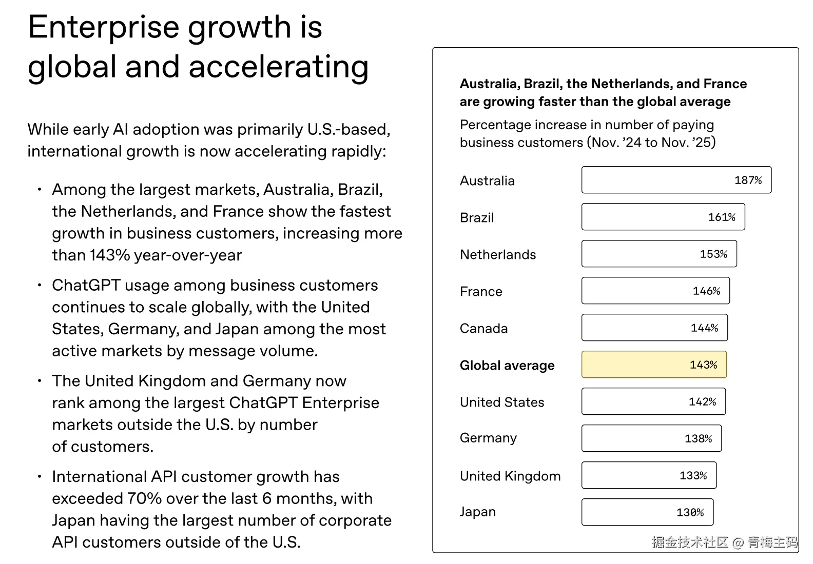 国际增长尤其亮眼。过去半年,国际API客户增长超70%。澳大利亚、巴西、荷兰、法国等国付费企业客户增长超143%,远高于全球平均。日本已成为美国之外最大的企业API市场。