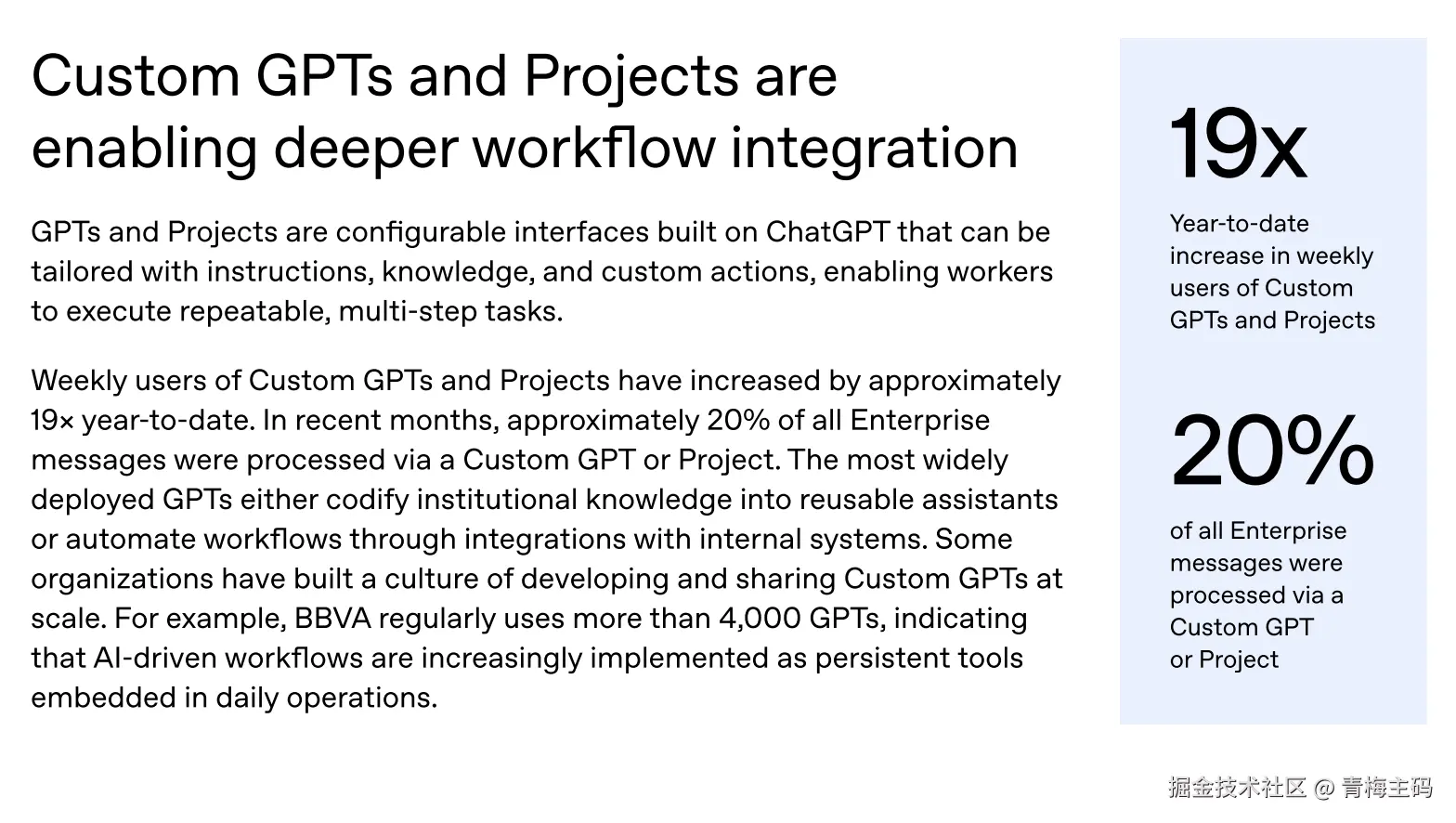特别值得注意的是,Custom GPTs和Projects功能让AI更贴合企业需求。这些可自定义的工具,能加载公司知识库、连接内部系统,帮助员工执行重复的多步骤任务。今年,Custom GPTs周活跃用户增长约19倍,约20%的企业消息通过它们处理。一些公司如BBVA已部署超4000个自定义GPT,形成内部AI工具生态。