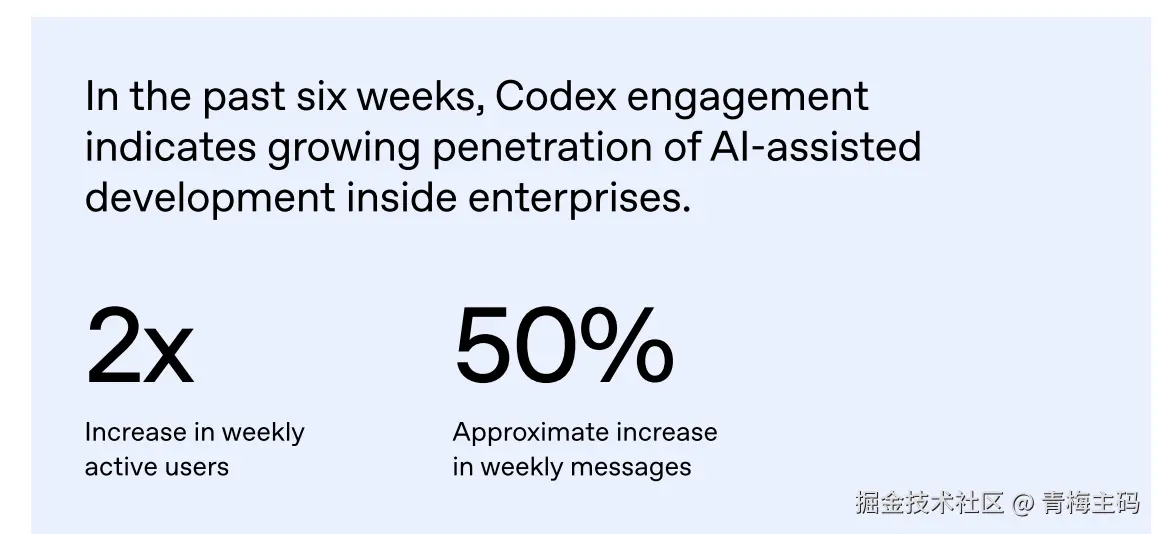 开发者侧,API调用也在爆发。超9000家组织处理超 100亿 token,近200家超过万亿 token。新模型Codex在代码生成、调试等端到端任务上表现亮眼,过去六周周活跃用户翻倍,消息量增长约 50%。