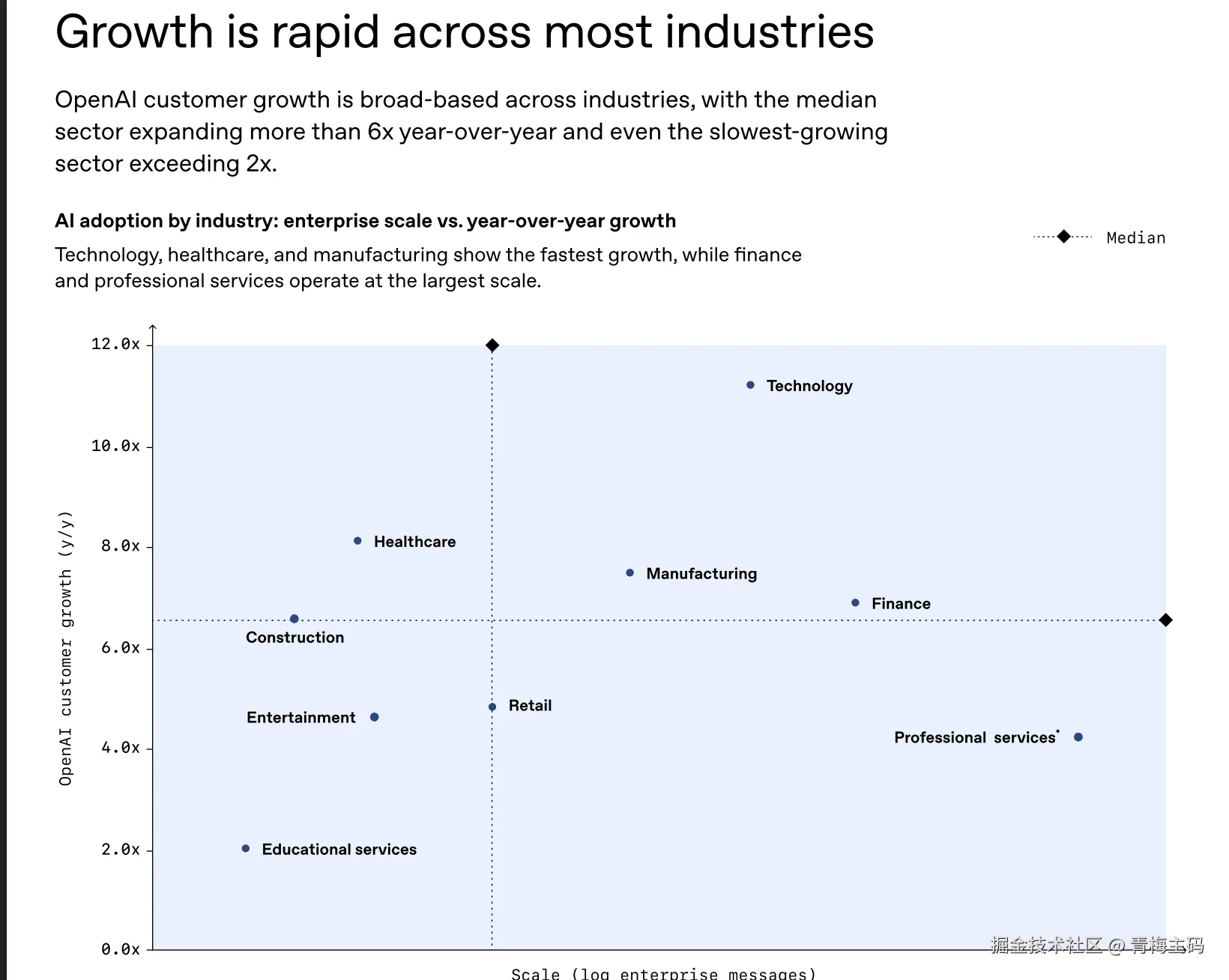 企业AI采用已遍地开花。过去12个月,中位行业客户增长超6倍,最快的是科技行业11倍,其次医疗8倍、制造7倍。规模最大的仍是专业服务、金融、科技行业。